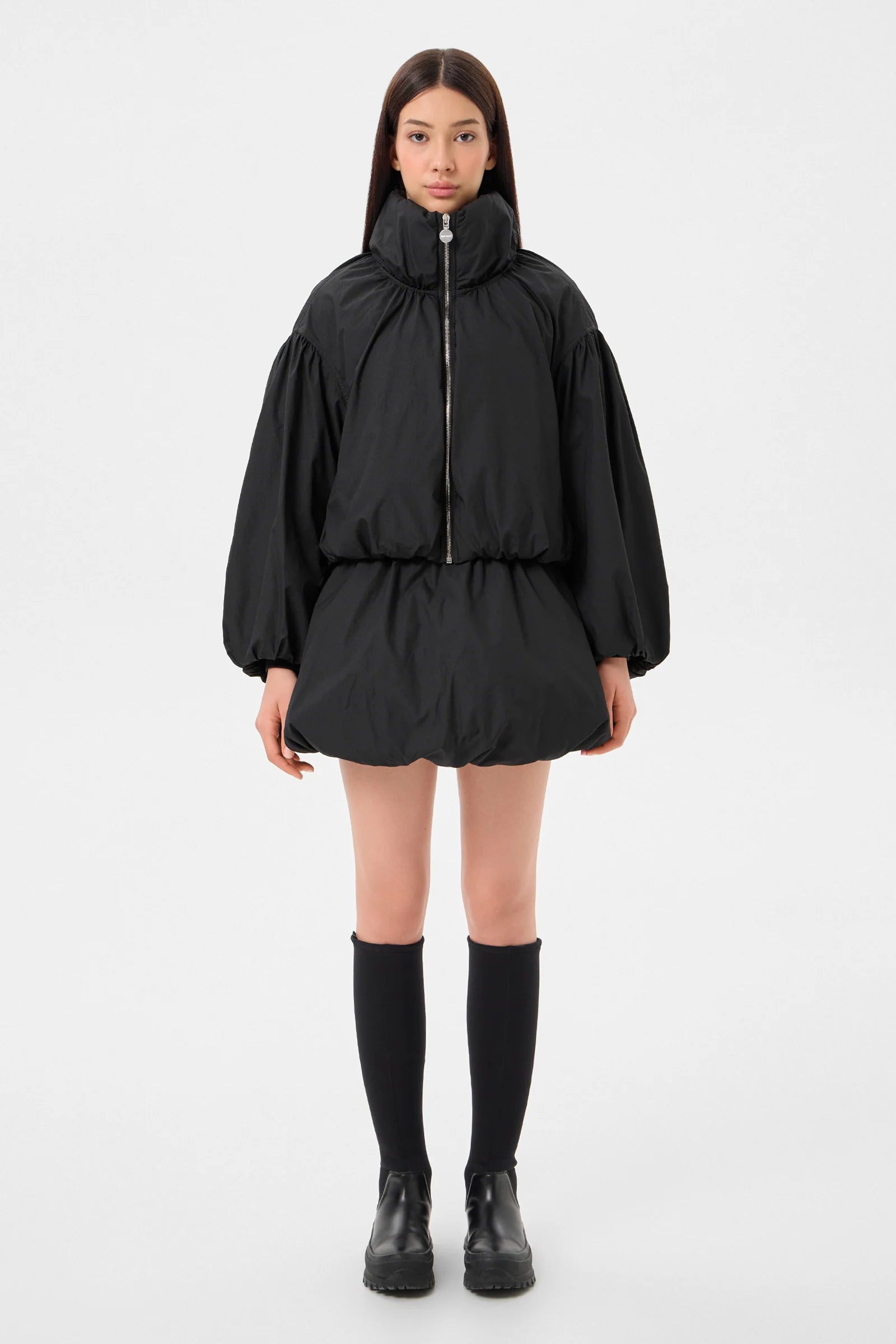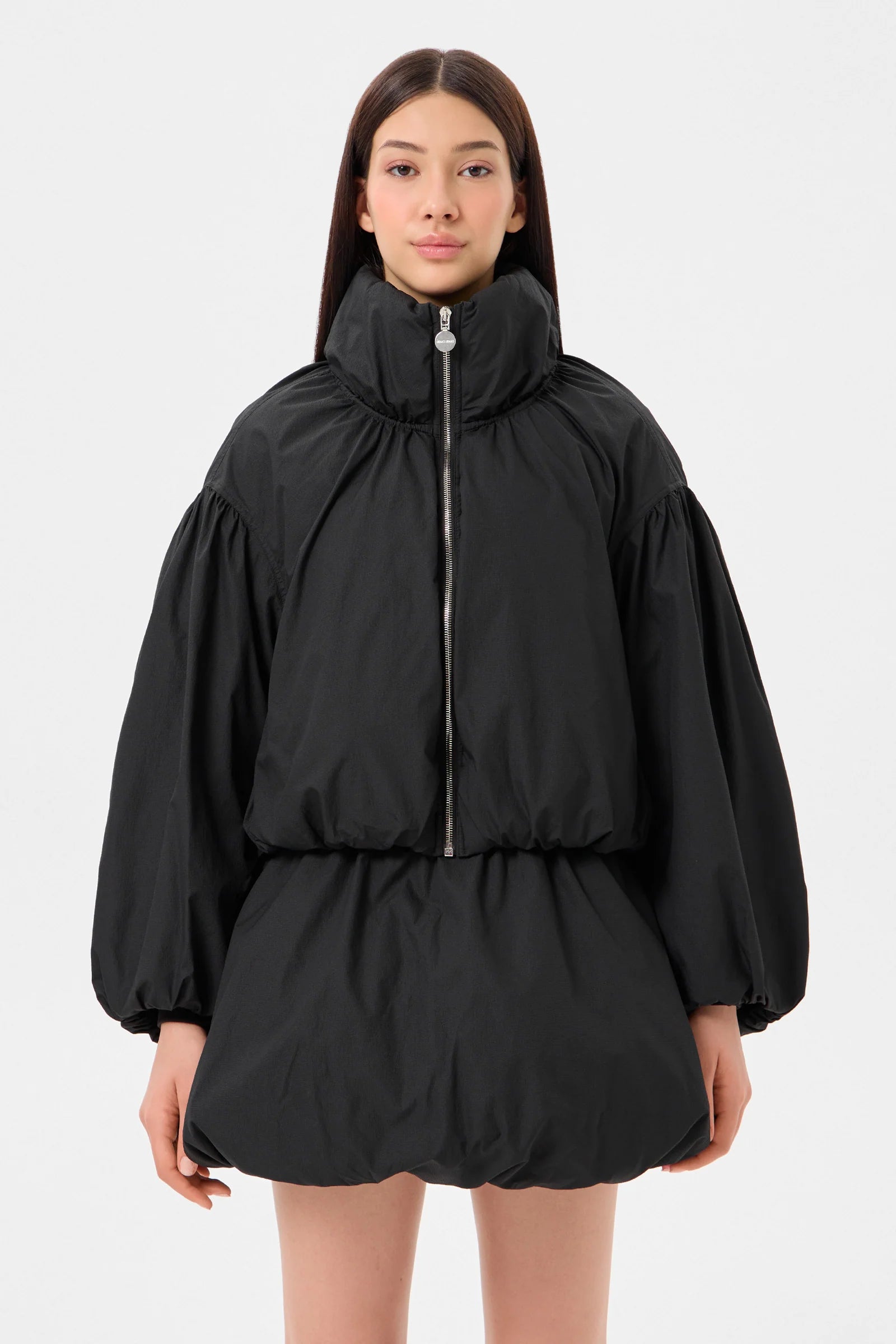 The BLOOM JACKET is a short jacket featuring voluminous sleeves, a high stand-up collar, and a drawstring hem — a blend of functionality and a bold silhouette for everyday looks.