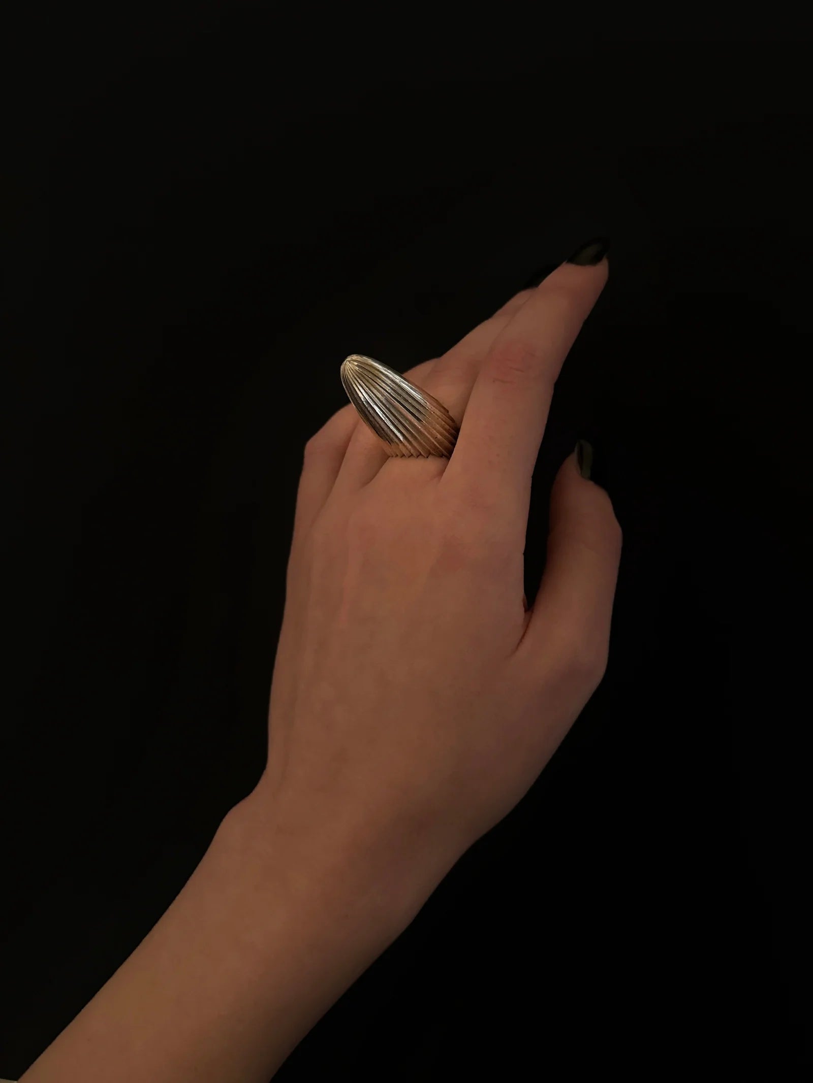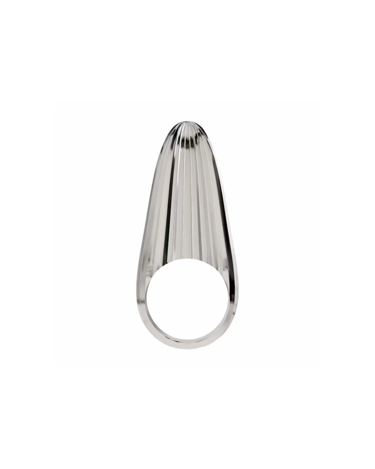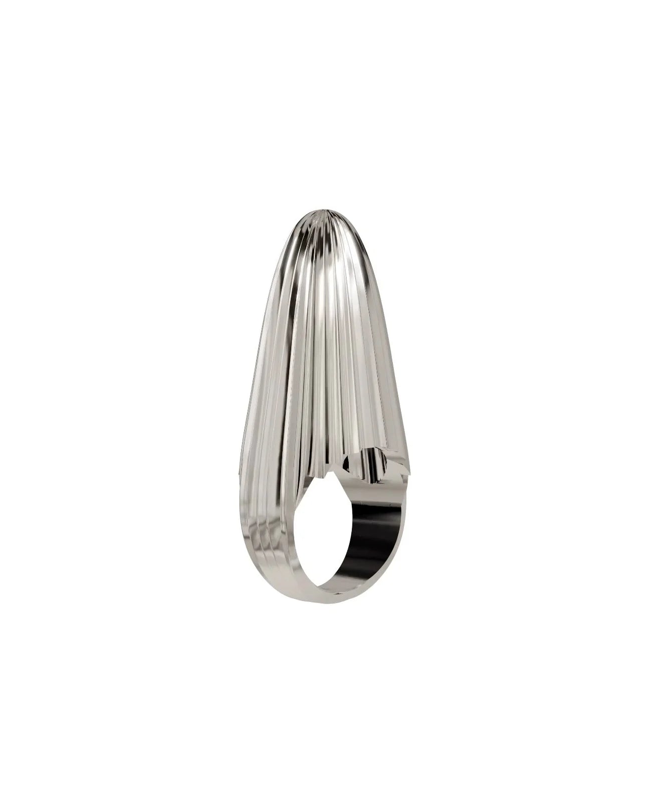 An architectural ring made completely of high-polish sterling silver. The form is a sculptural cone shape that points upward, detailed with sharp, textured ridges. This piece showcases static power; wear this angular form when pure structure is the main element.