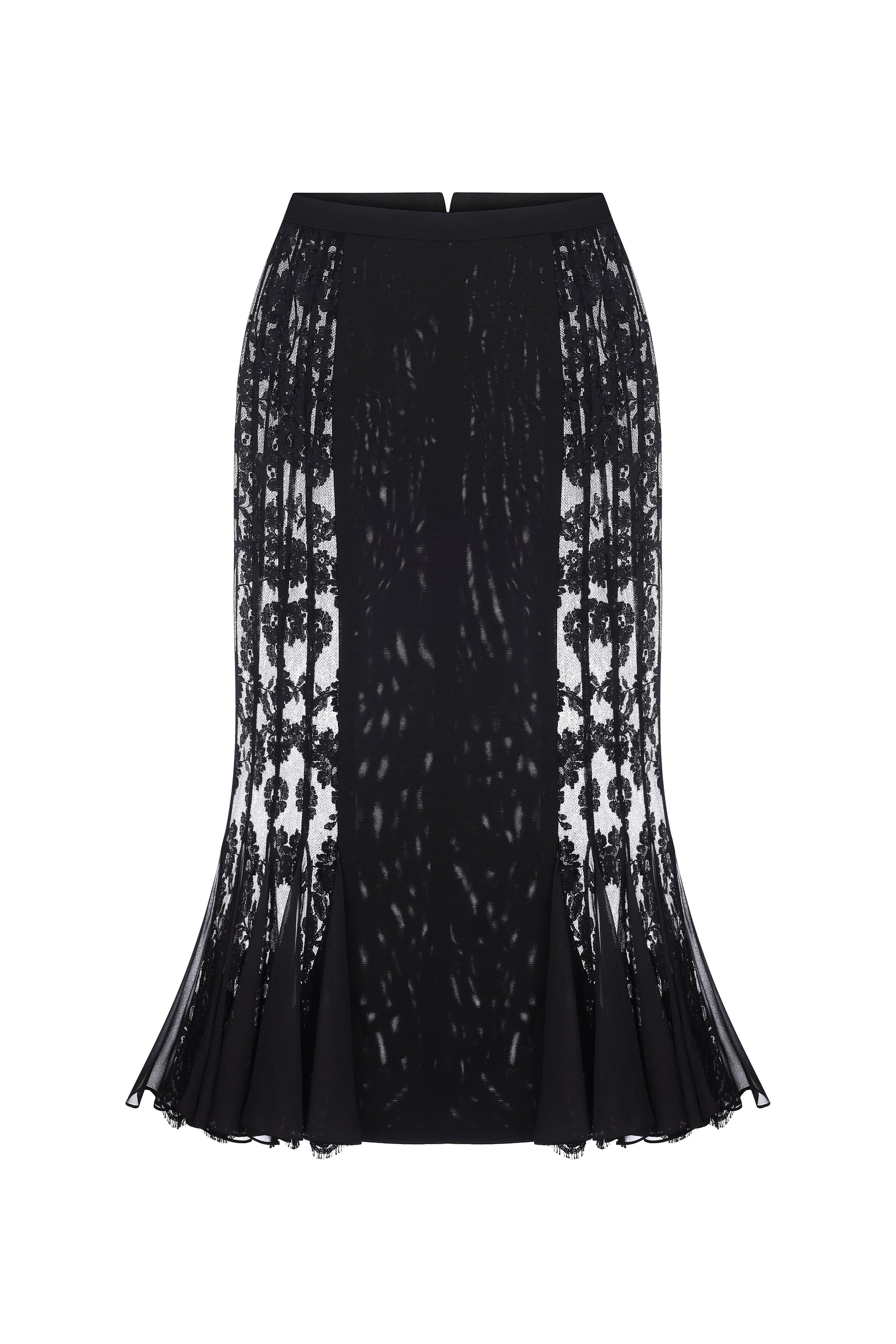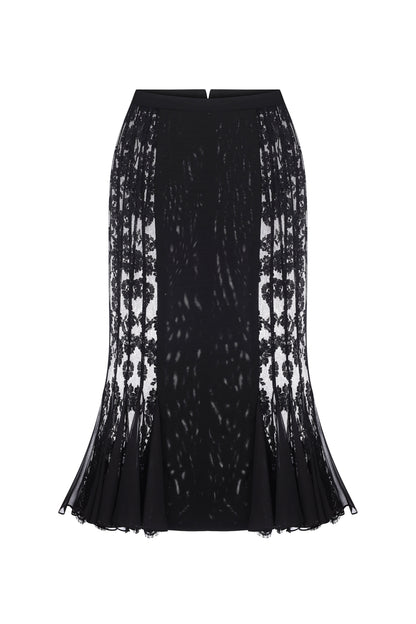 Corset-style midi skirt with a sheer mesh fabric and delicate lace details along the sides. A perfect choice for an elegant yet bold look, accentuating the waist and adding a touch of charm. Pairs beautifully with various tops for an evening or special occasion outfit.