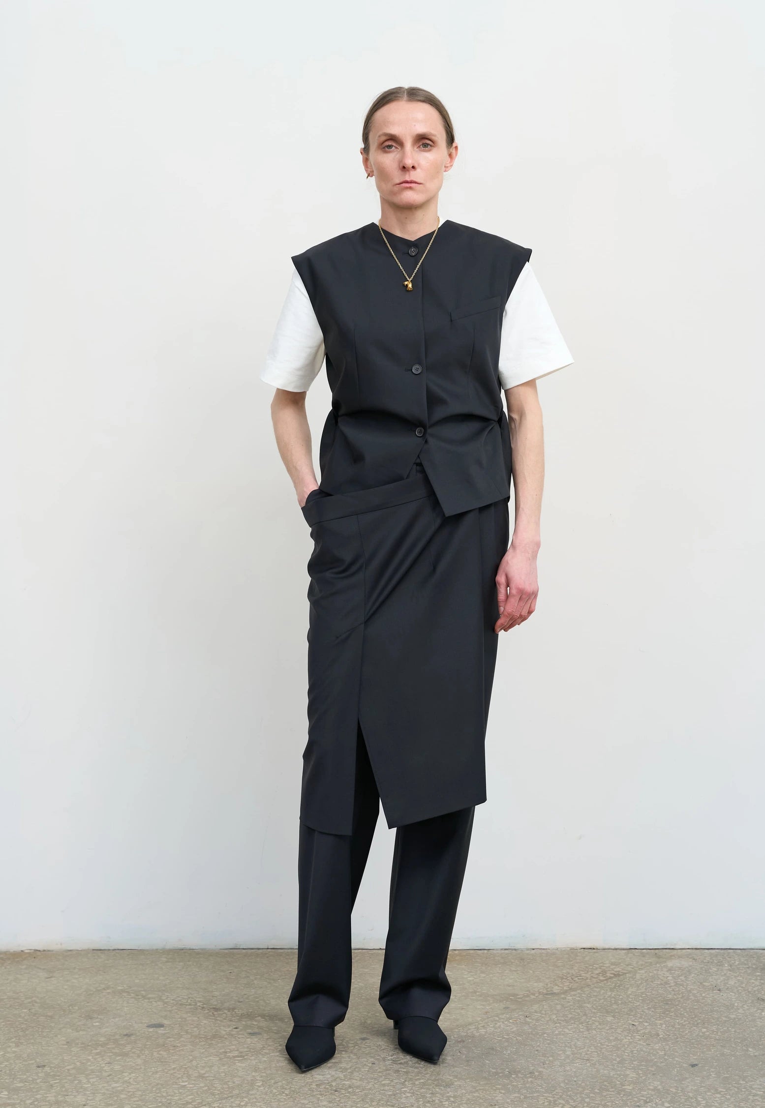 A wool-blend vest with draped sides for a relaxed and modern look.
