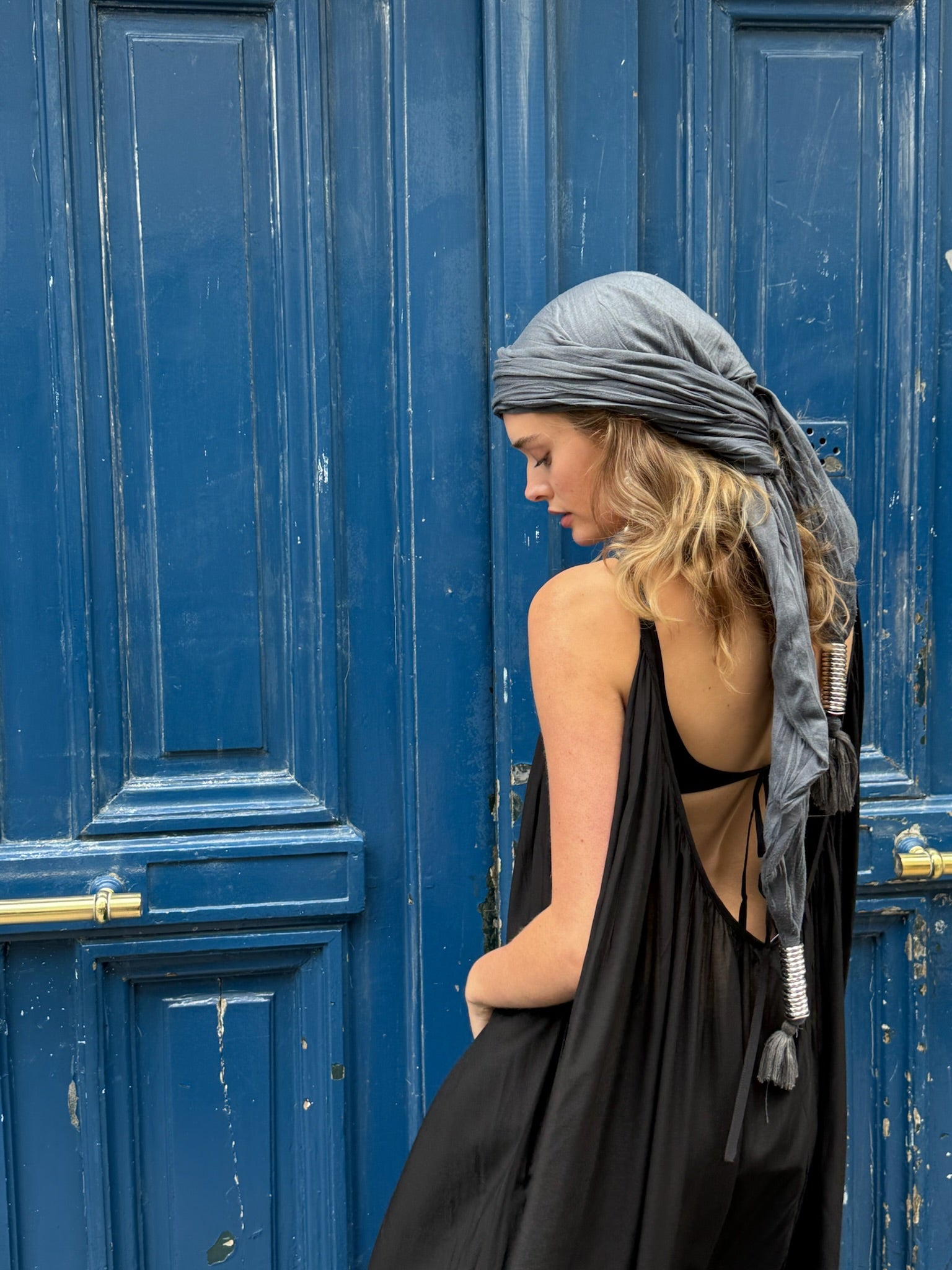 Flowy, floor length, charcol black dress. The gathers hide the shape of your body in an elegant way, this dress is a silent statement of your refinement.