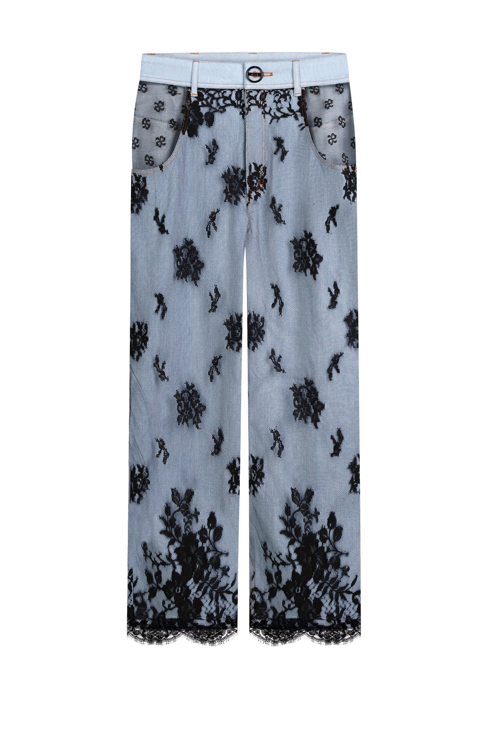 A bold reinterpretation of classic denim, these FROLOV jeans merge everyday structure with couture sensuality. Cut in a relaxed straight silhouette, the light blue denim base is entirely overlaid with delicate black floral lace, creating a striking contrast between masculine tailoring and romantic transparency.