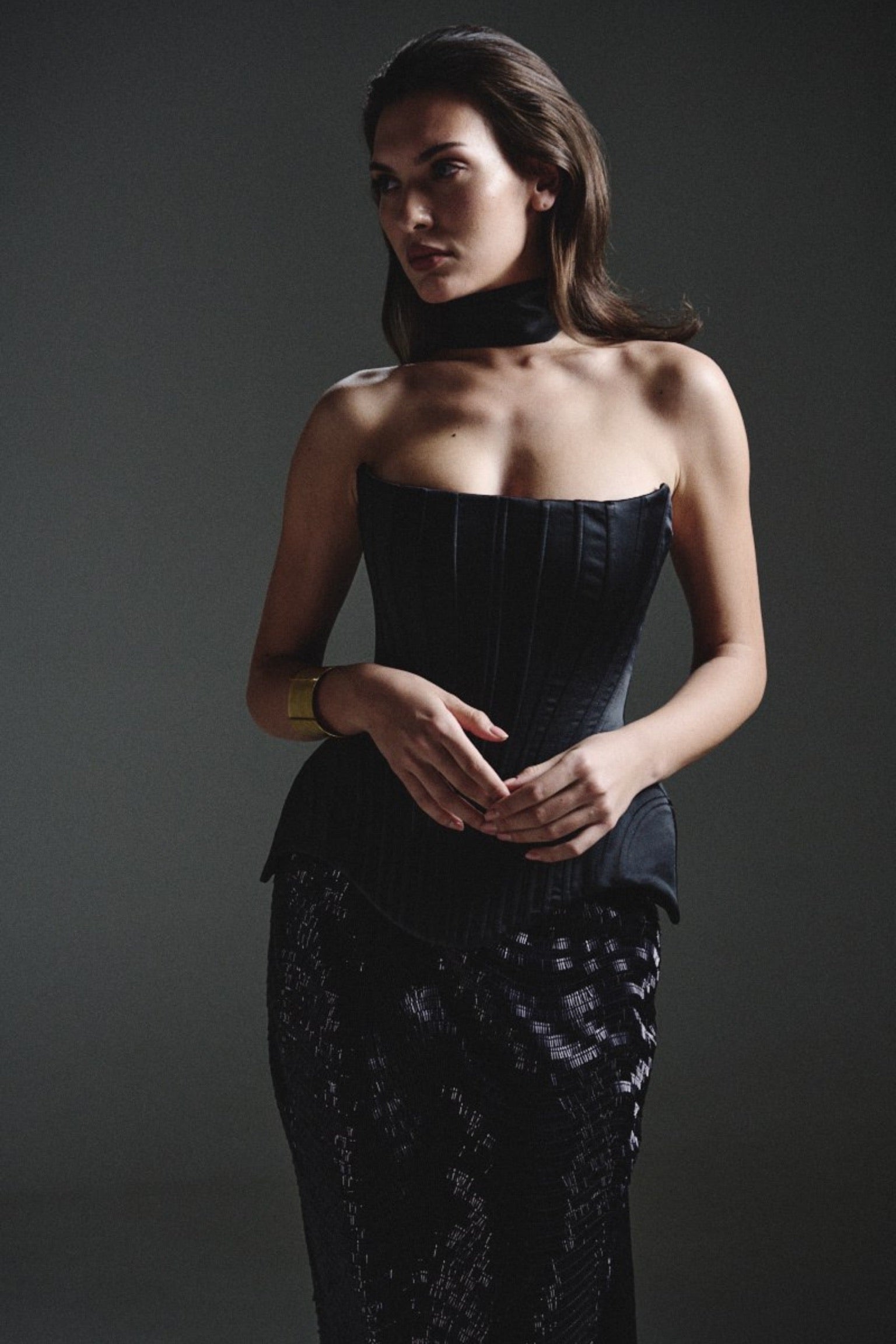 This corset with a soft satin sheen accentuates the waist and beautifully defines the lines of the hips. Precise seams and geometric construction shape a striking silhouette with a modern character and a gentle focus on the body’s natural form.