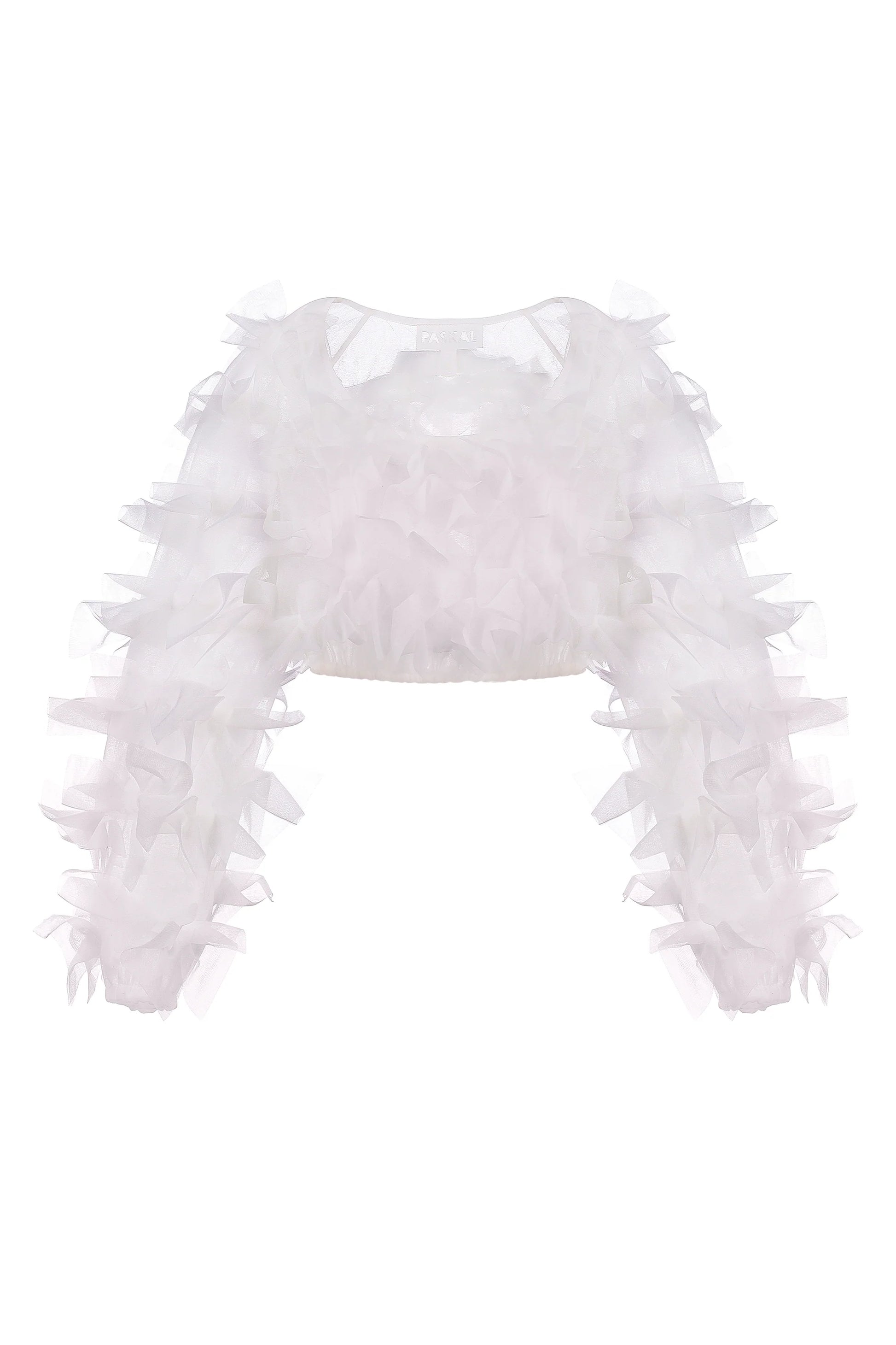 "The silhouette of a basic crop top is reconstructed around romanticism. Its slightly loose fit exaggerates the feeling of airiness. The carefree item gets sculptural, being covered with hand-folded bows. Wear the Juliette top with a coordinating ‘Avril’ skirt, your favorite baggy jeans, or tailored pants.
