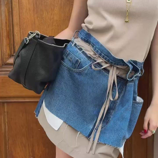 Dare to stand out in this edgy asymmetrical denim mini skirt—featuring a bold, layered cut that adds instant attitude to any outfit. Perfect for making a chic, fashion-forward statement wherever you go.