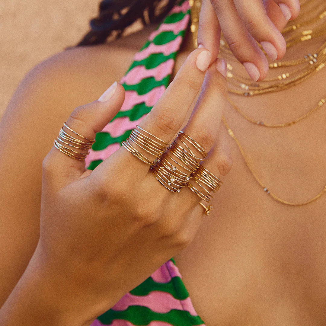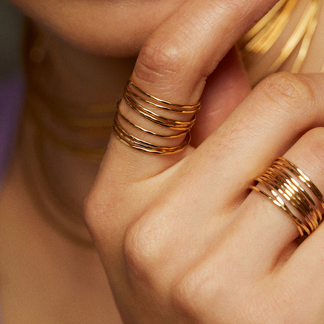 9 turns ring, hand hammered and gold plated. 24K gold plated to ensure a long lifespan. Rings contain no allergenic metals, only brass, copper, and gold.