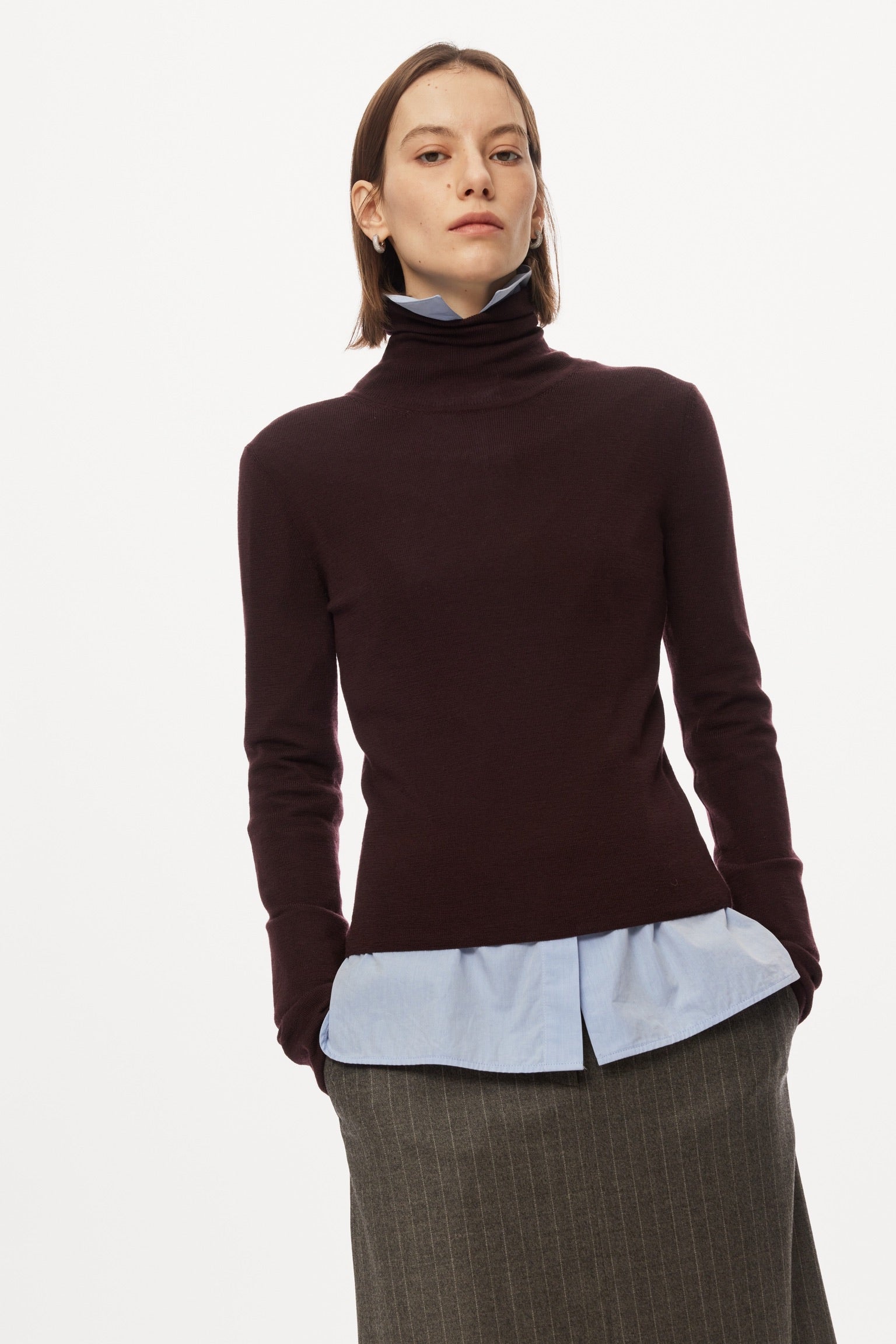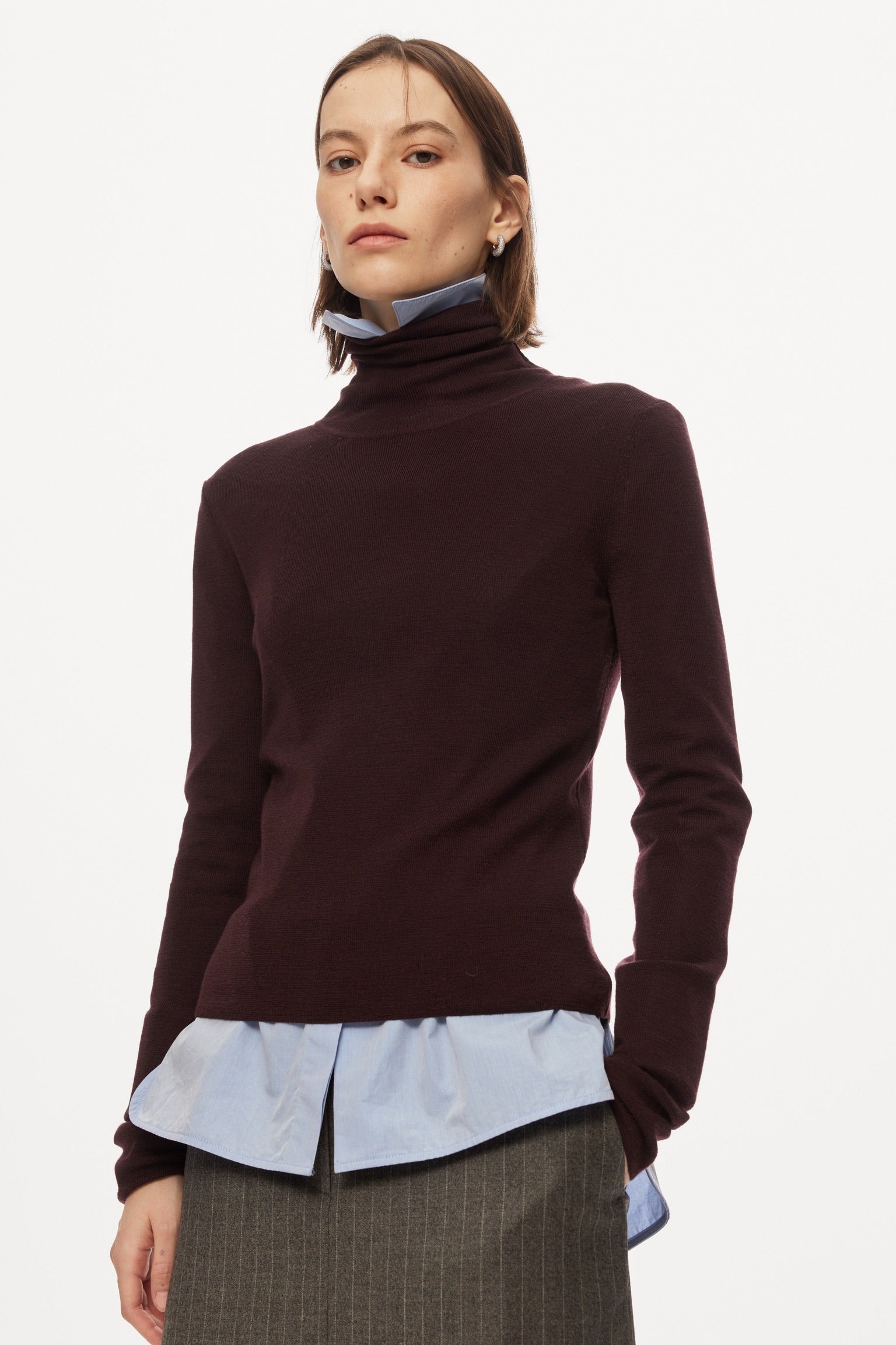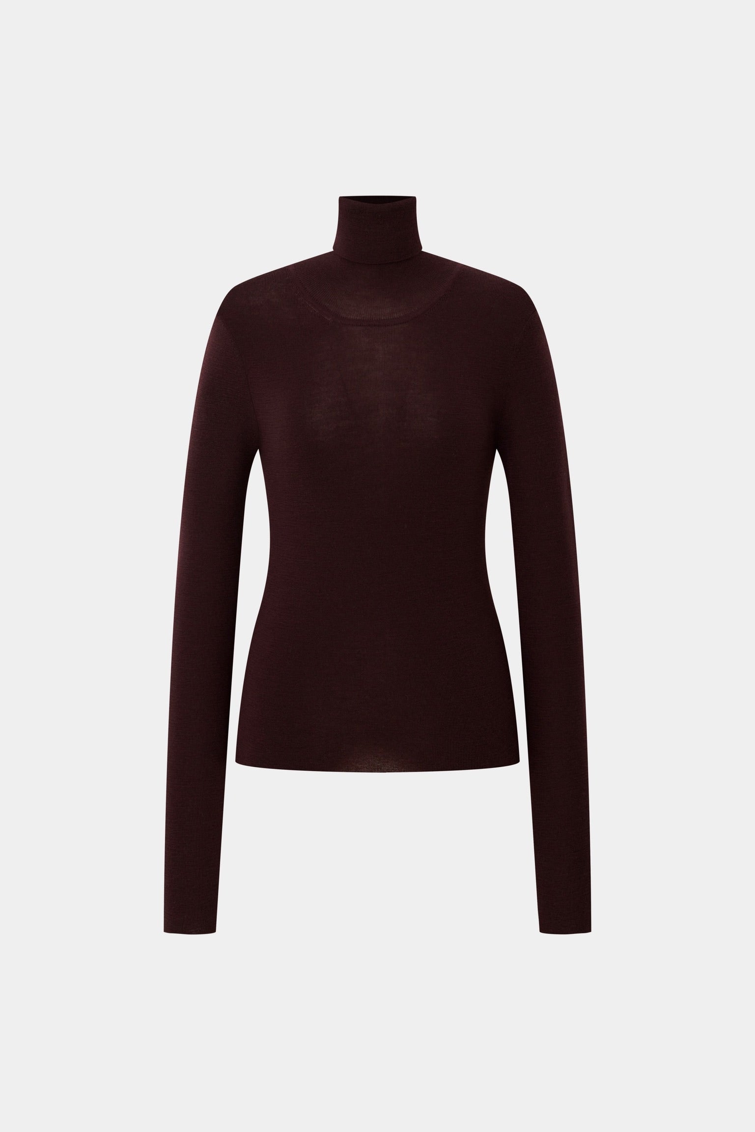 A timeless turtleneck in a deep red-wine hue. Scott’s fine-gauge knit sits close to the body for a clean, elegant silhouette — wear it alone with a skirt or layered under a blazer for instant polish. Minimal details, maximum versatility.