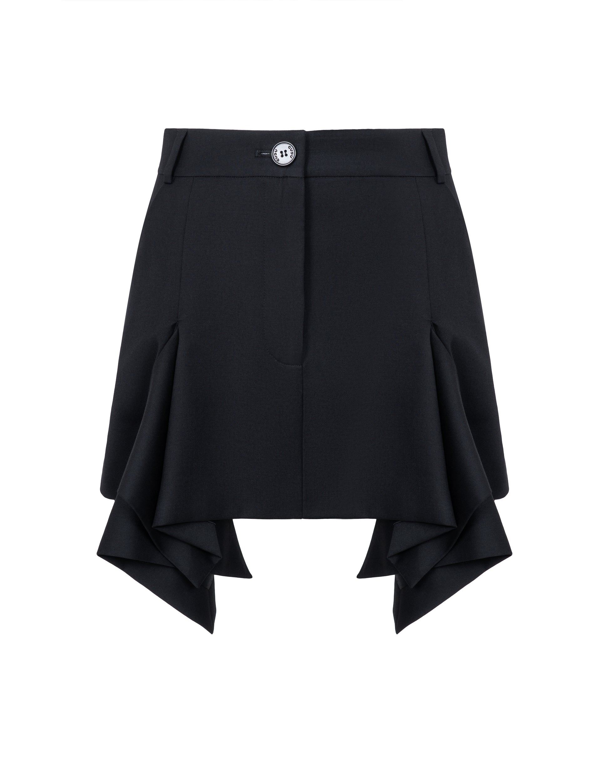 Gored mini skirt with two slanted side pockets. Zip and button closure. Waistband with belt loops
