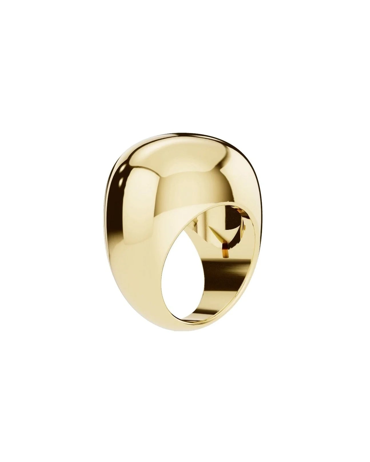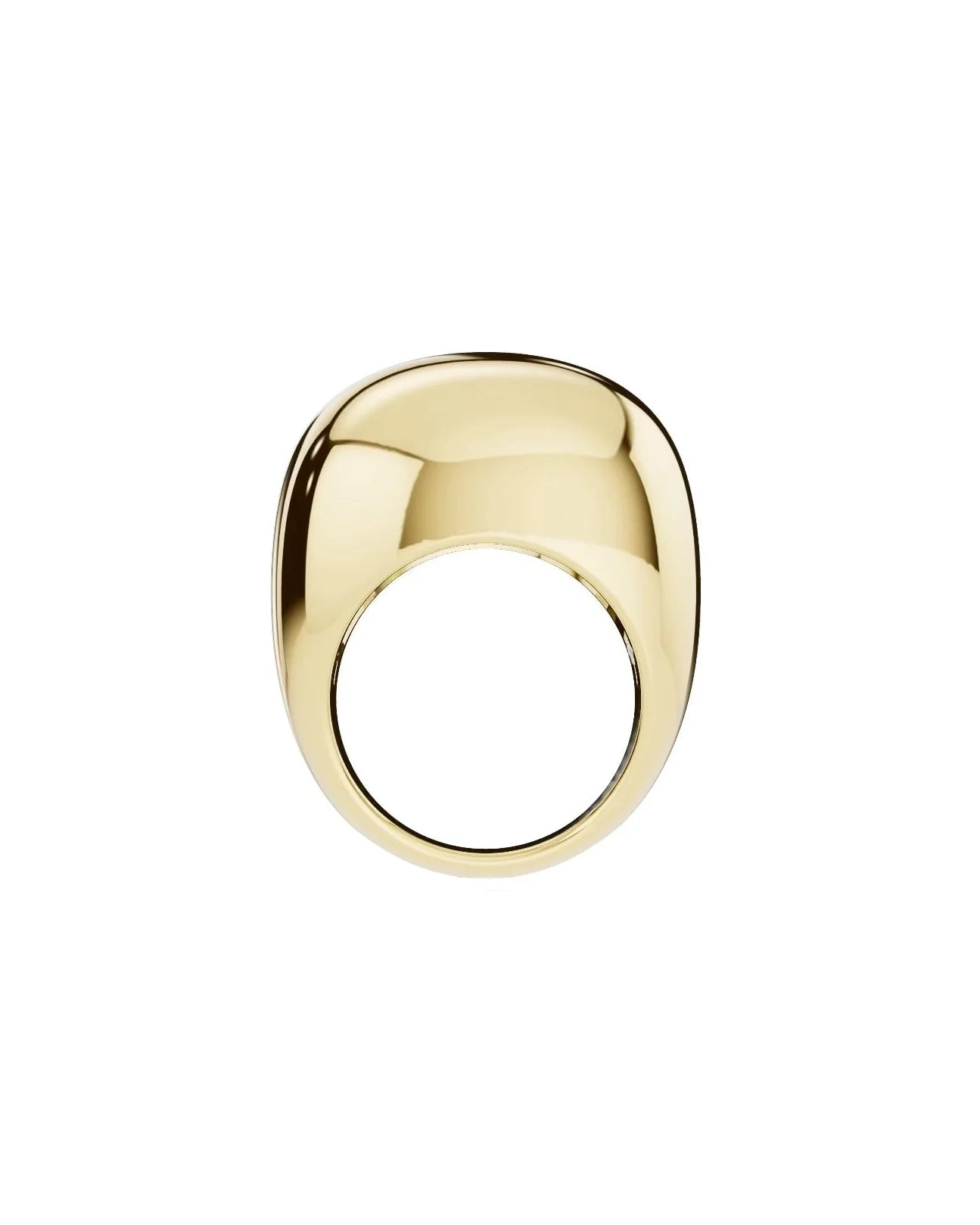 This ring is crafted from gold-coated brass. The shape is a heavy, rounded square with a mirror-like finish that emphasizes its clean lines. This piece acts as an anchor; wear it alone or use its structure to ground any layered combination.
