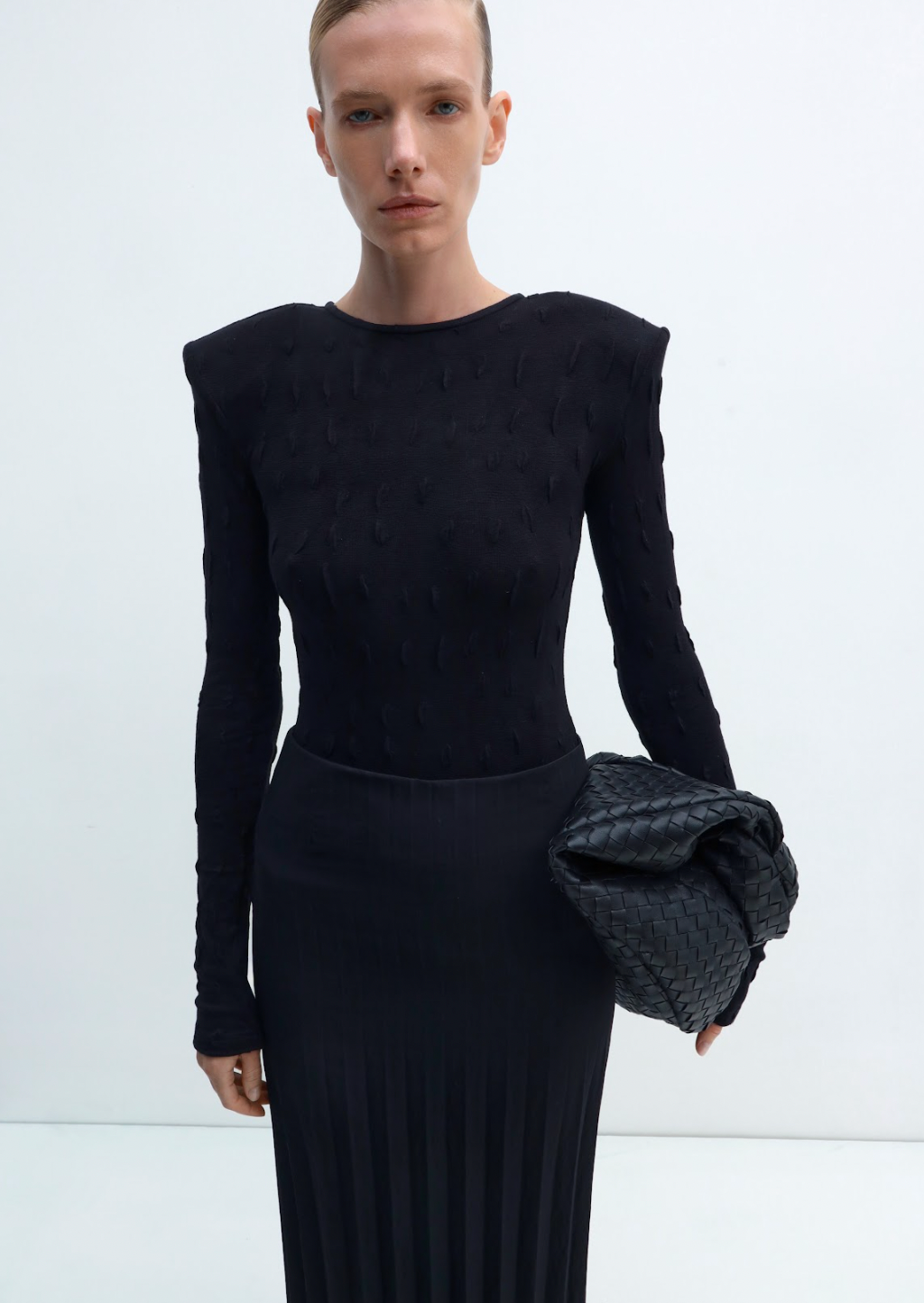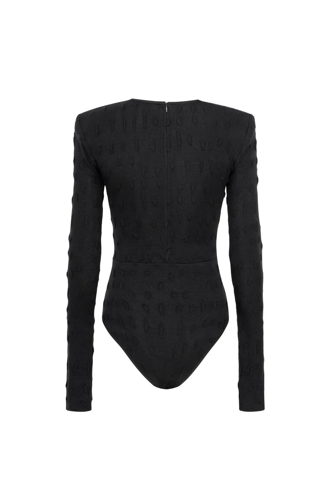 Classic-style bodysuit with volume shoulder pads and sleeves. Relief pattern. Hook-and-eye closure Made in Kyiv atelier