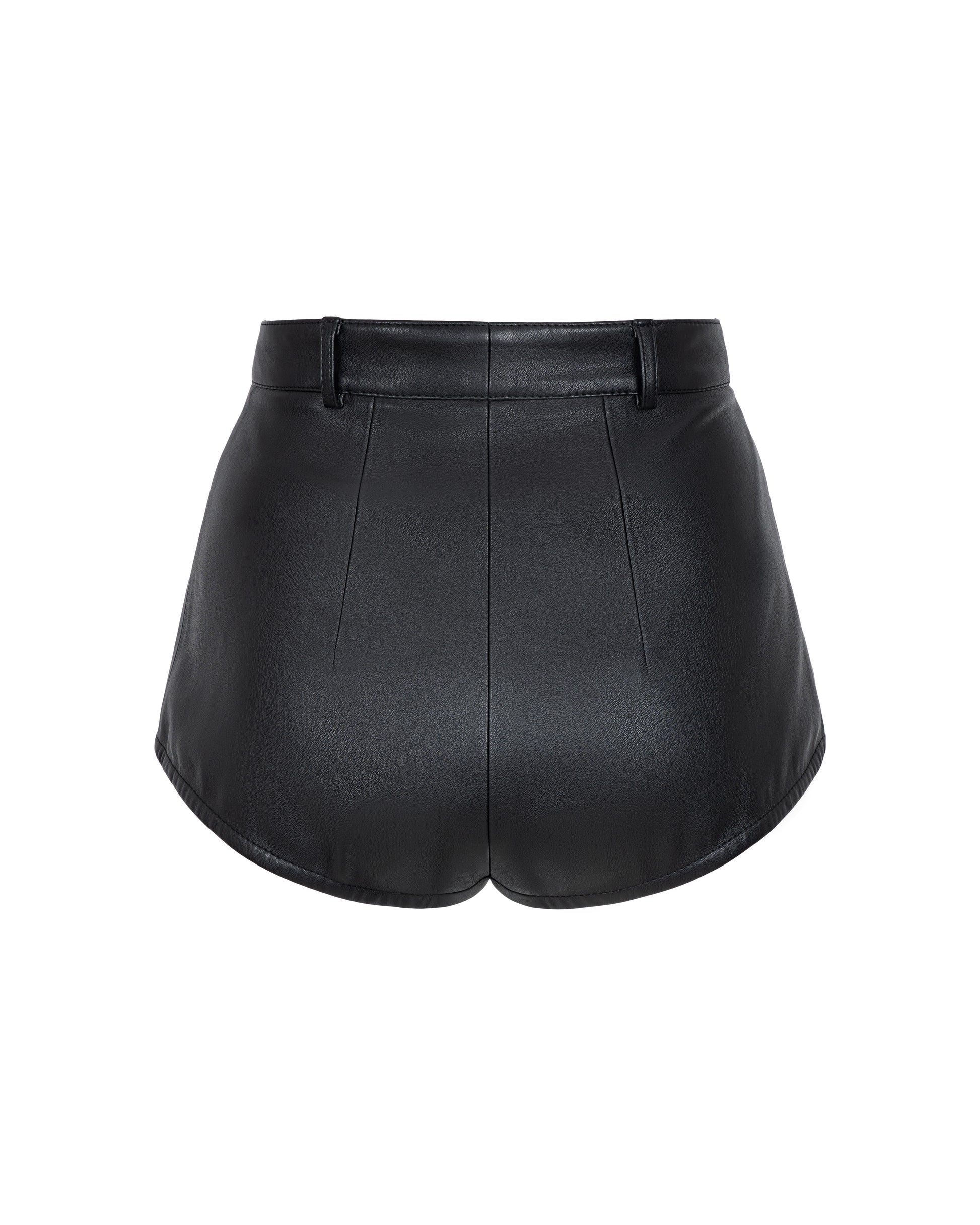 Eco-leather shorts. Zip and button closure. Waistband with belt loops