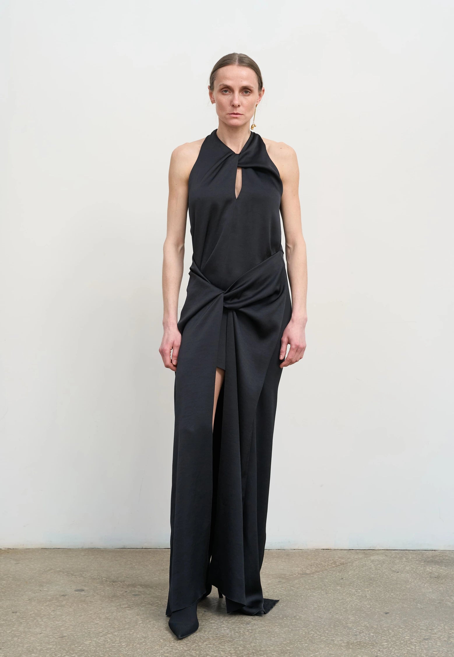 A sleek black dress featuring an elegant twisted halter neckline, a dramatic open back, and a rear slit for a refined yet sensual silhouette.