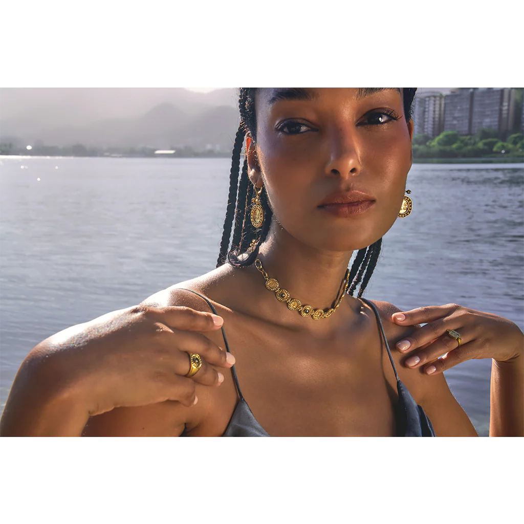 Gold-plated brass choker necklace, 1 micron of 999/1000 gold and semi-precious stones. Available in Gold/Pyrite. Articulated design at the joints between each medallion.