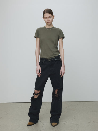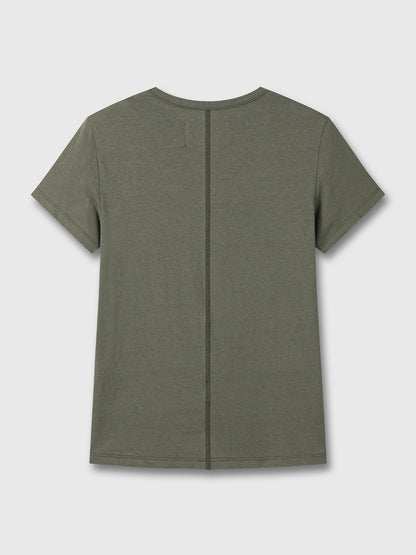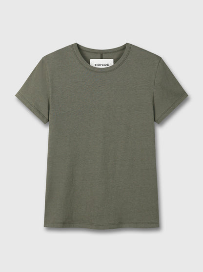 This crewneck short-sleeved T-shirt is made of cotton cashmere blend fabric. The Odlamp sewing technique applied to the center back is a detail that considers both functionality and design, minimizing discomfort from the stitching touching the skin while providing a sophisticated finish. The slim silhouette and classic crewneck design are combined to make this a daily item that can be naturally matched with any style, and it is a product that allows you to feel both luxury and practicality.