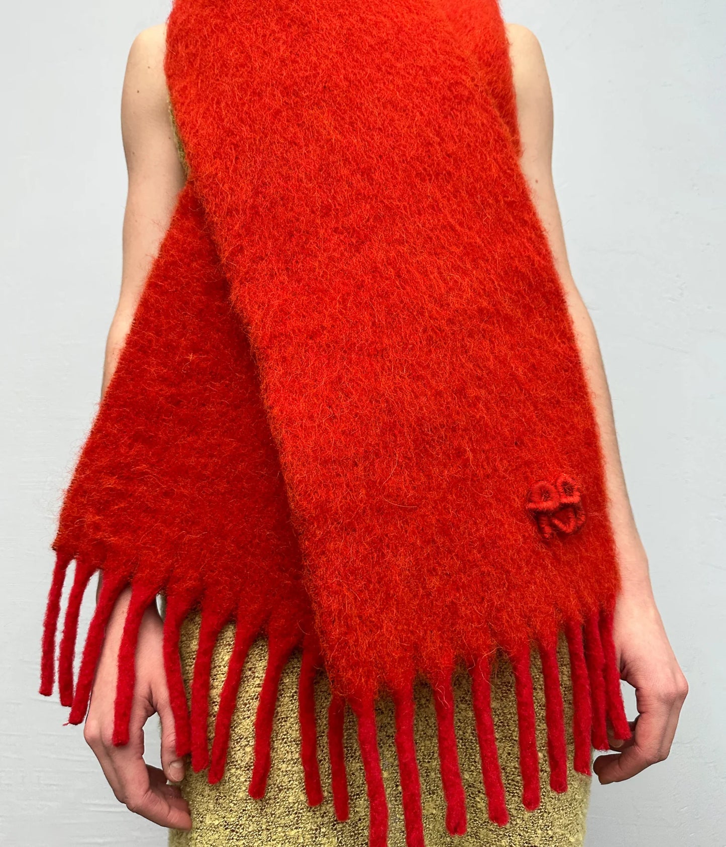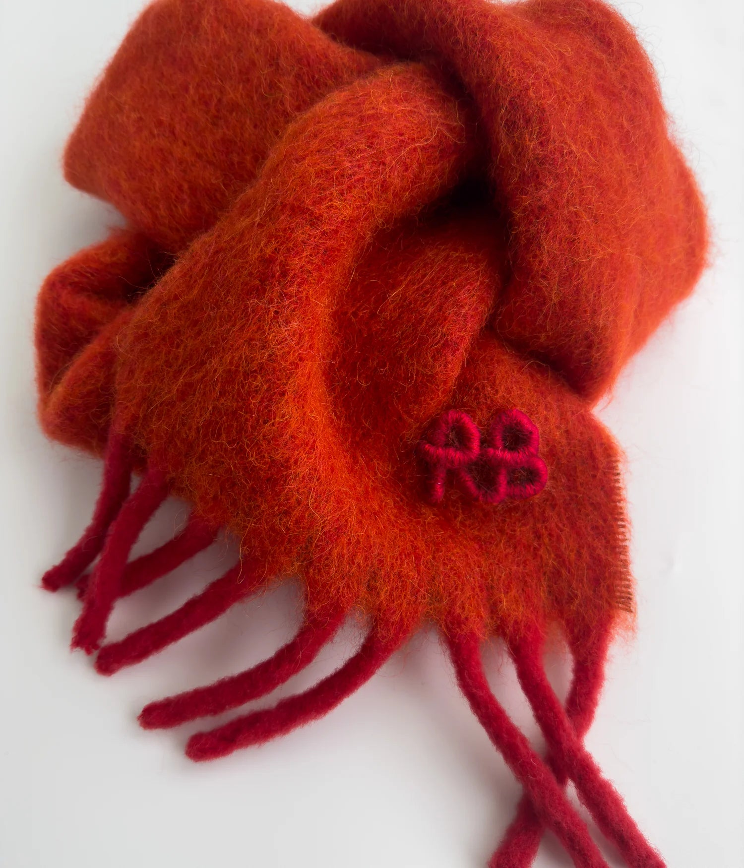 Ruslan Baginskiy medium-length scarf is embellished with a contrasting fringe and pastel RB logo. The shades of wintertime nature informed the colour palette, which varies from grey to red. And the heartwarming effect is transferred by the wool, mohair, and alpaca blend.