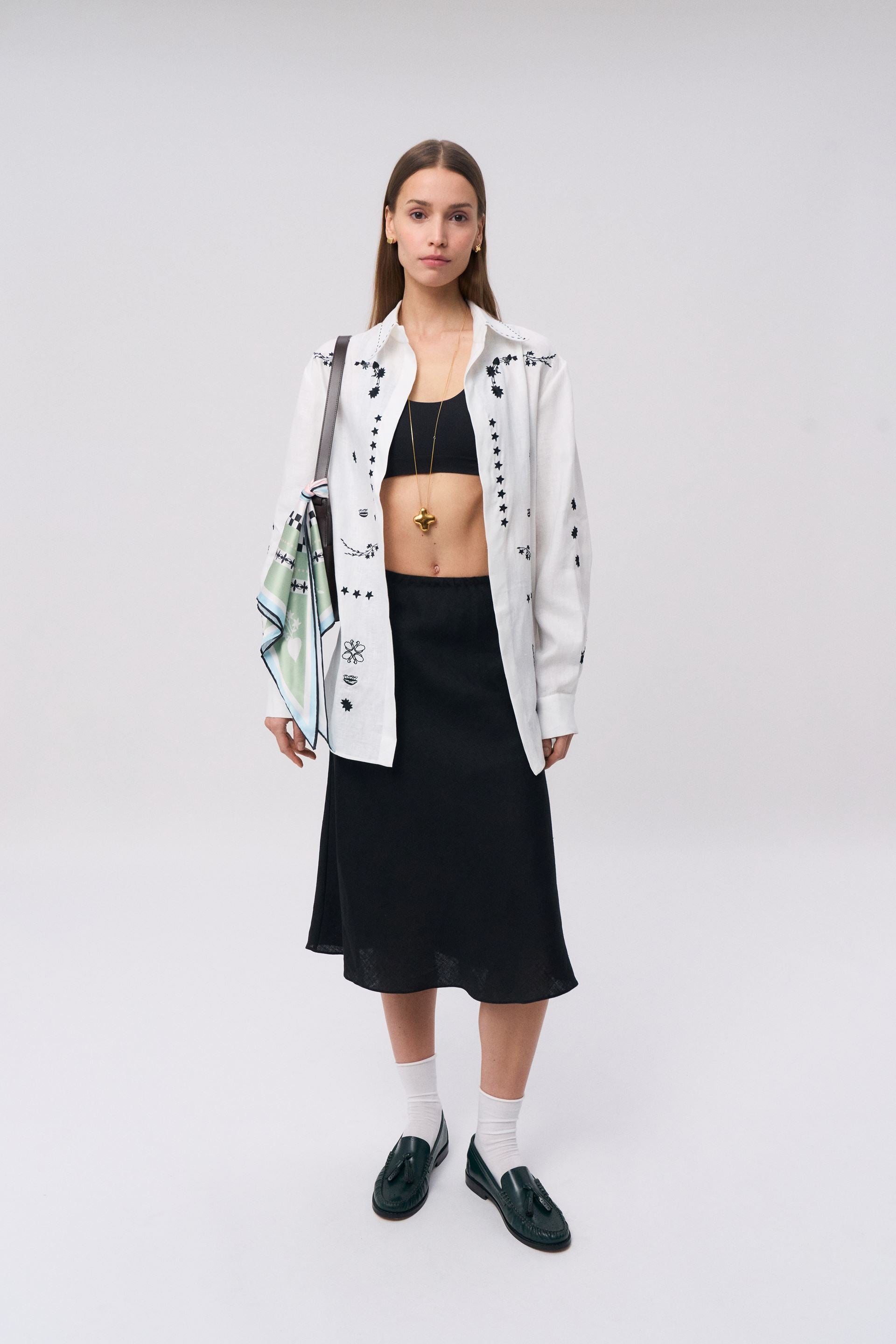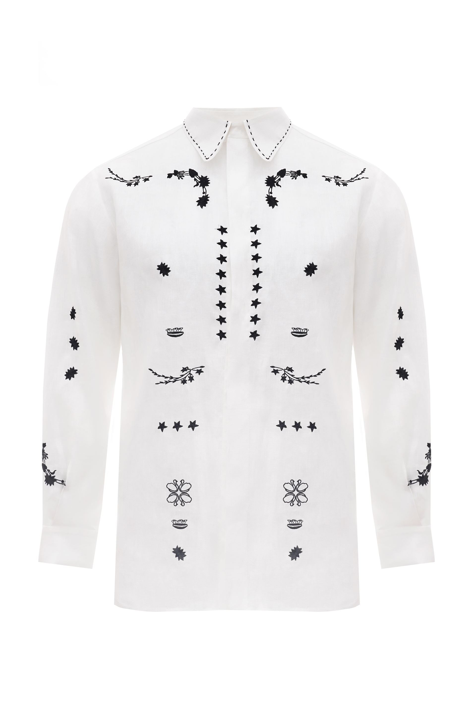 Ivor Embroidered Shirt. A modern element of everyday or festive attire that can become a collectible, heirloom garment. Regular fit, hand-finished collar. Crafted from natural linen and high-tech TENCEL™ blend, the shirt is adorned with designer embroidery, inspired by the naïve rushnyky from the 20th century, including pieces from the brand’s private archive, curated to preserve and promote traditional embroidery.