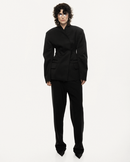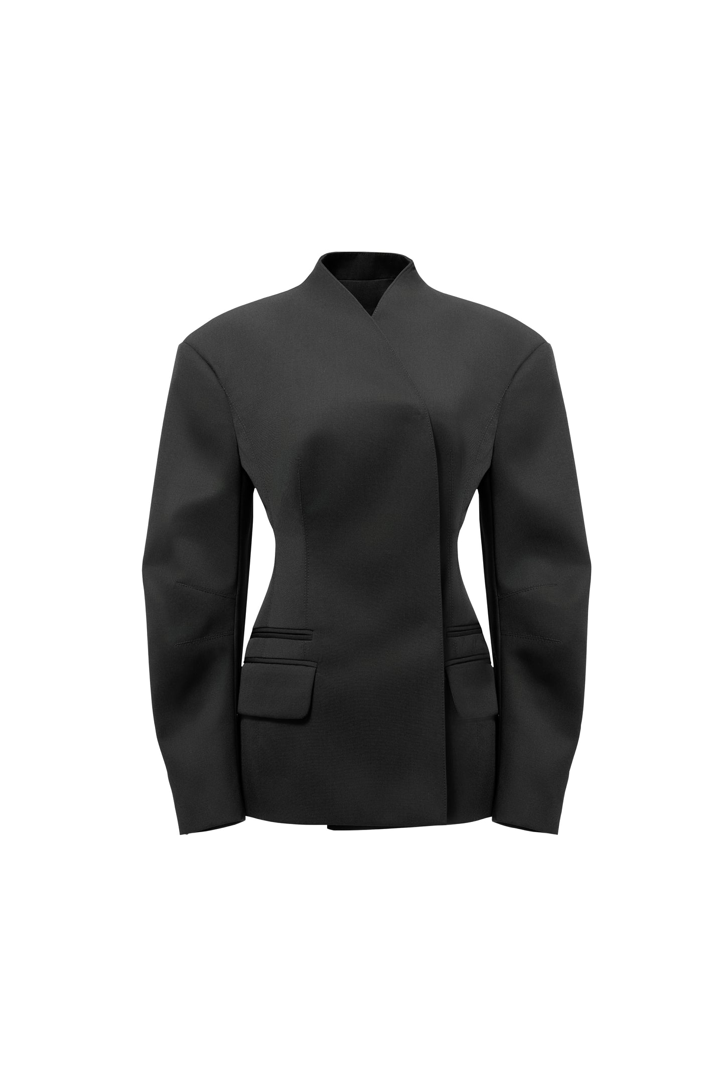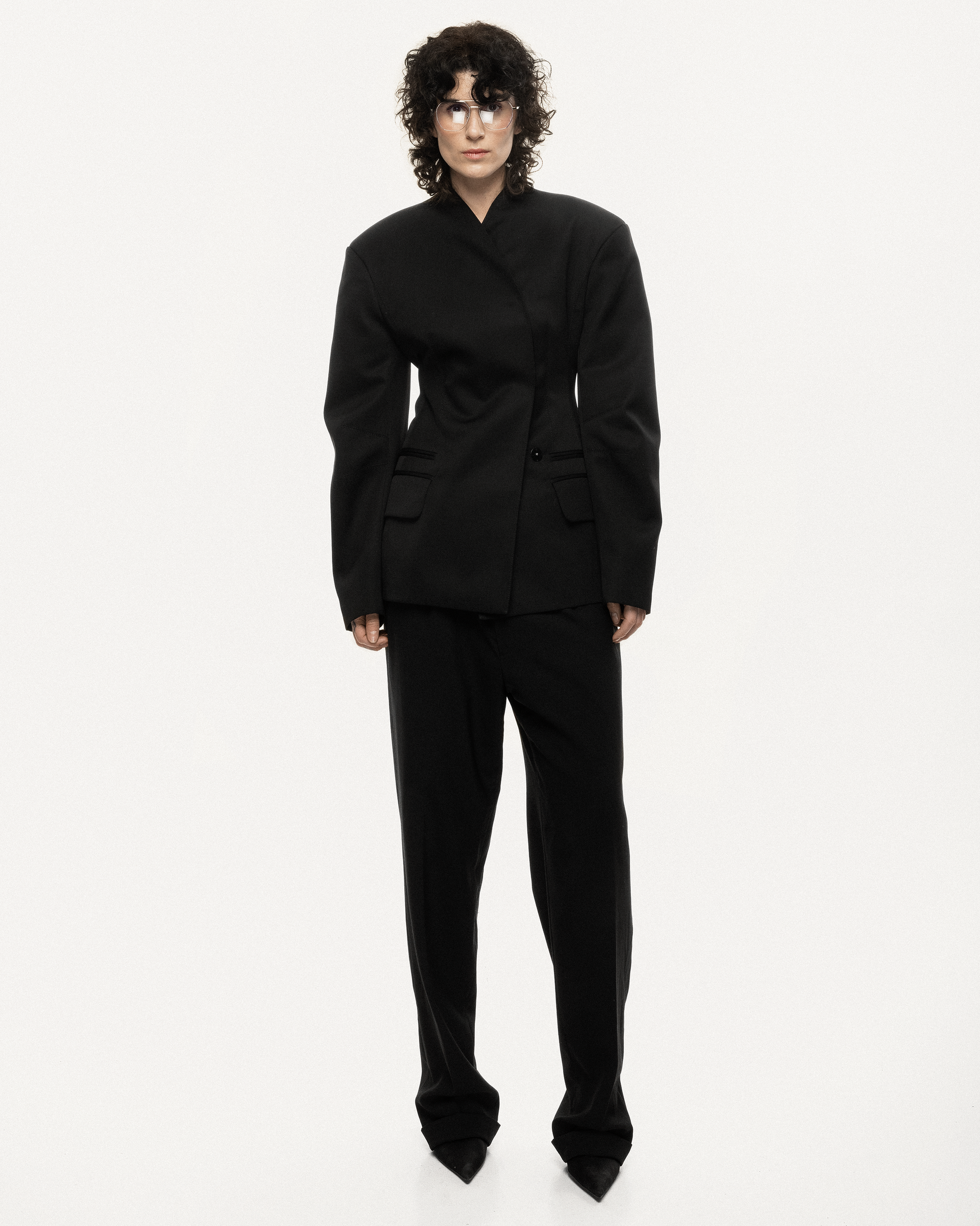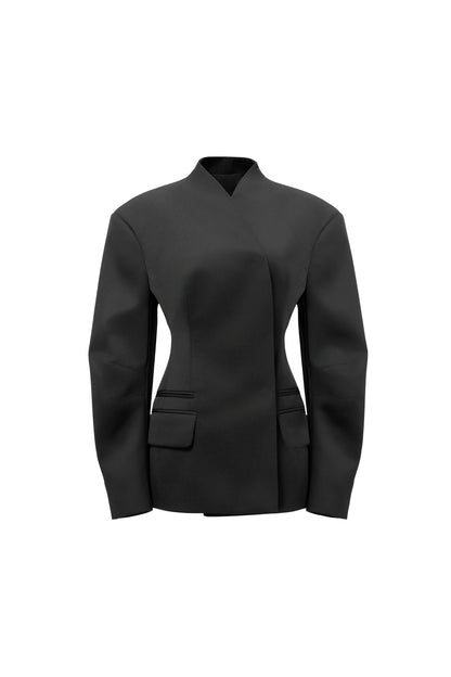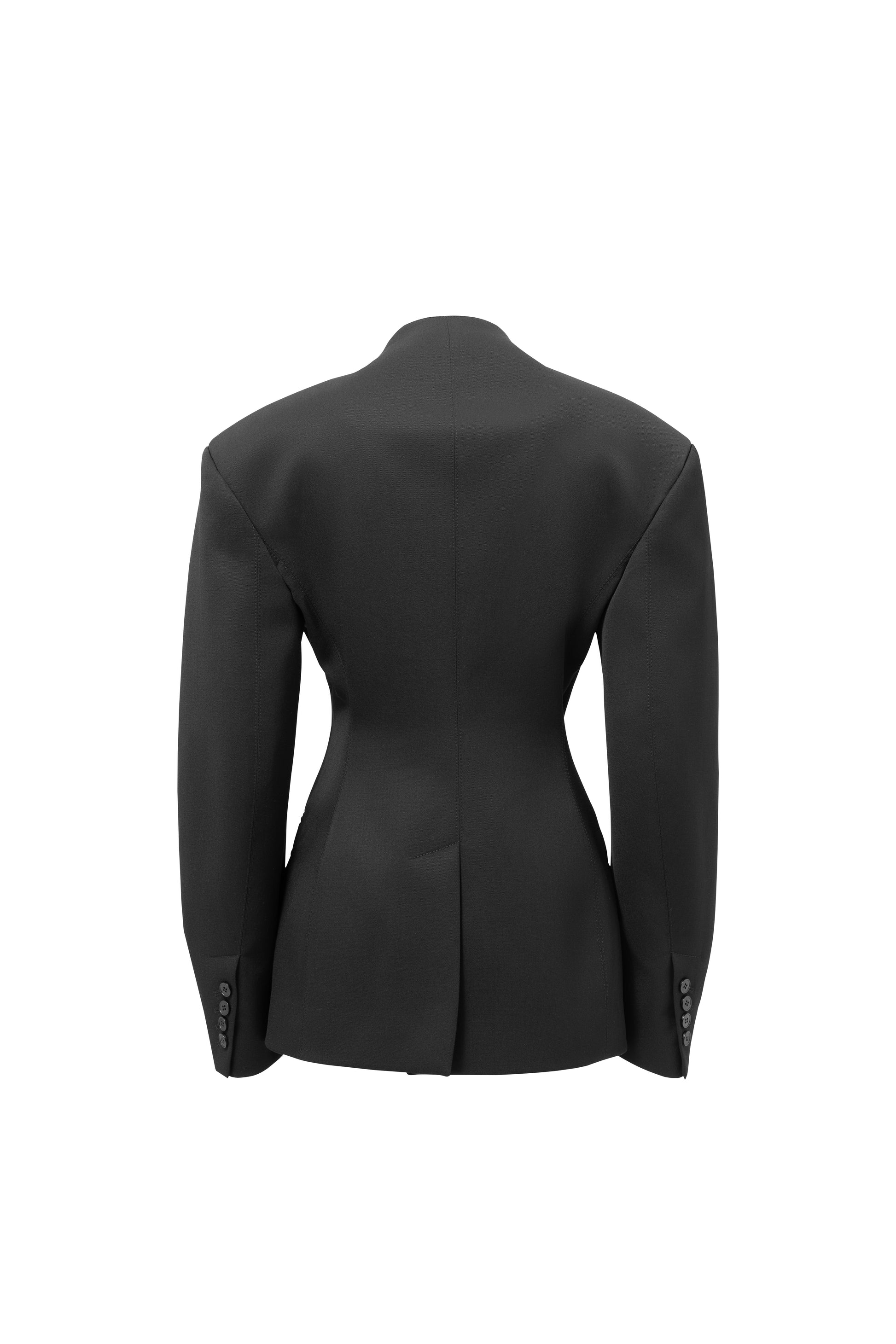 Structured blazer with a sharp, tailored silhouette. Double-layered shoulder design. Classic notched lapel with three-button front closure.