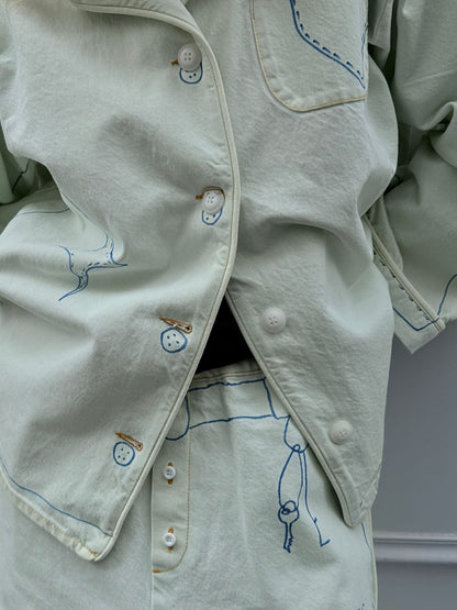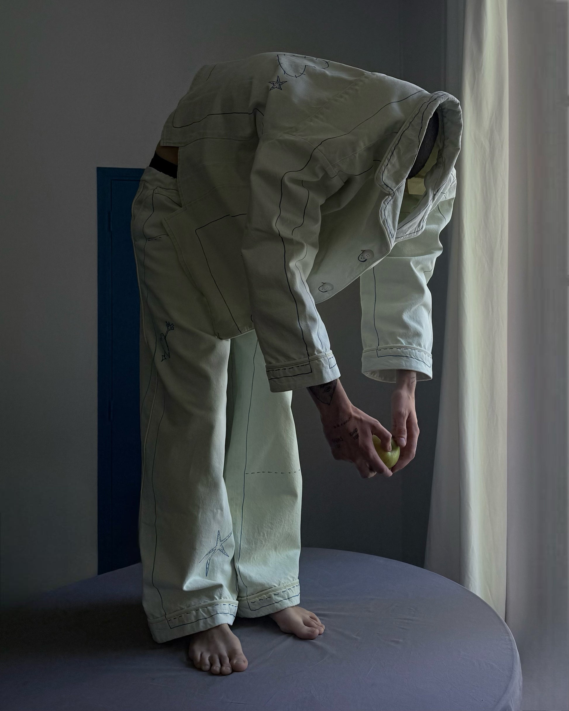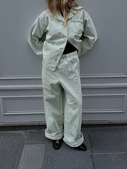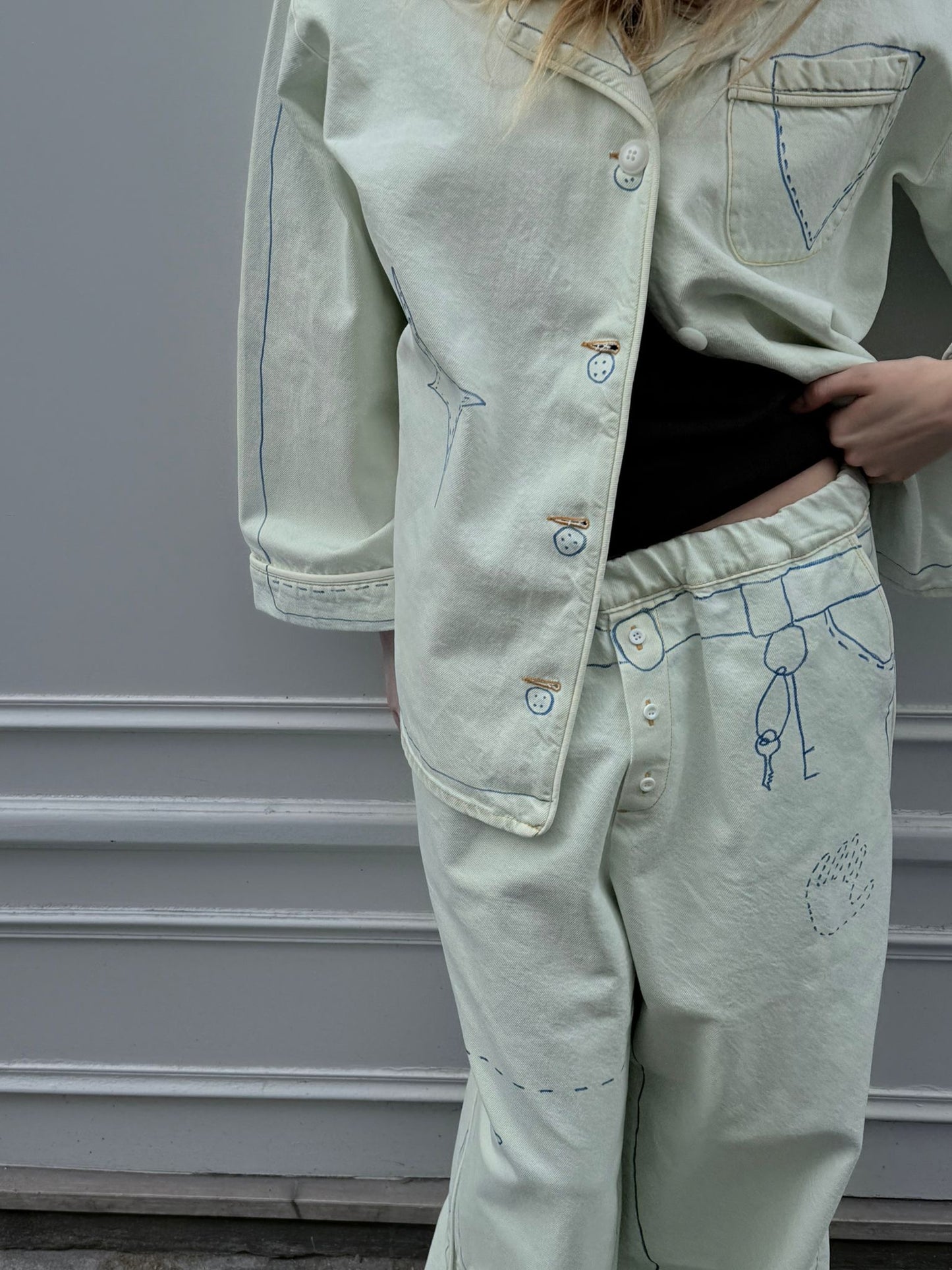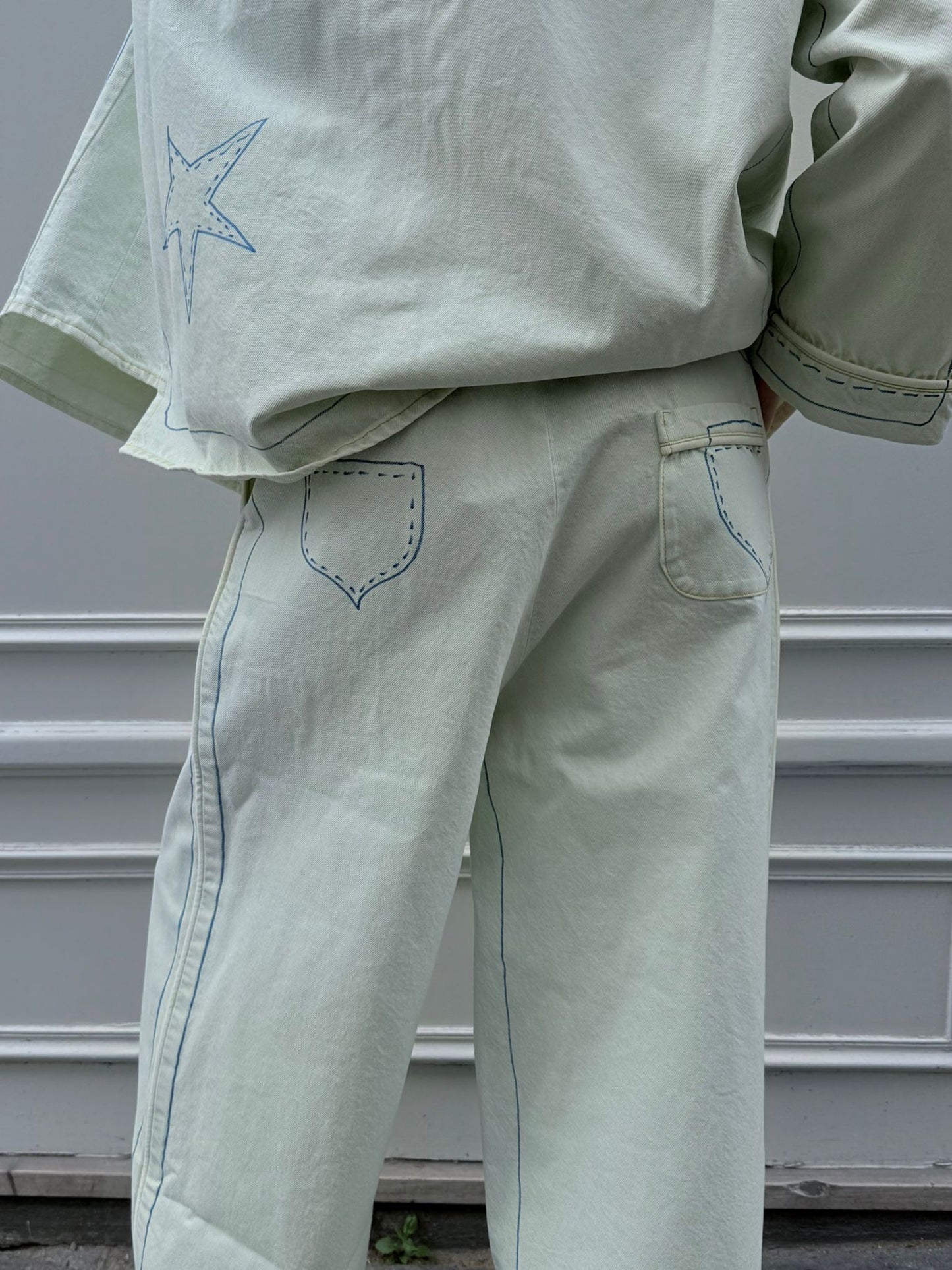 These jeans are from the second drop of Retelleter x Ksenia Schnaider, featuring original hand-painted details in the signature Retelleter style. Crafted from light blue denim with a subtle greenish tint, they offer a loose, baggy fit with an oversized, pyjama-inspired cut.
