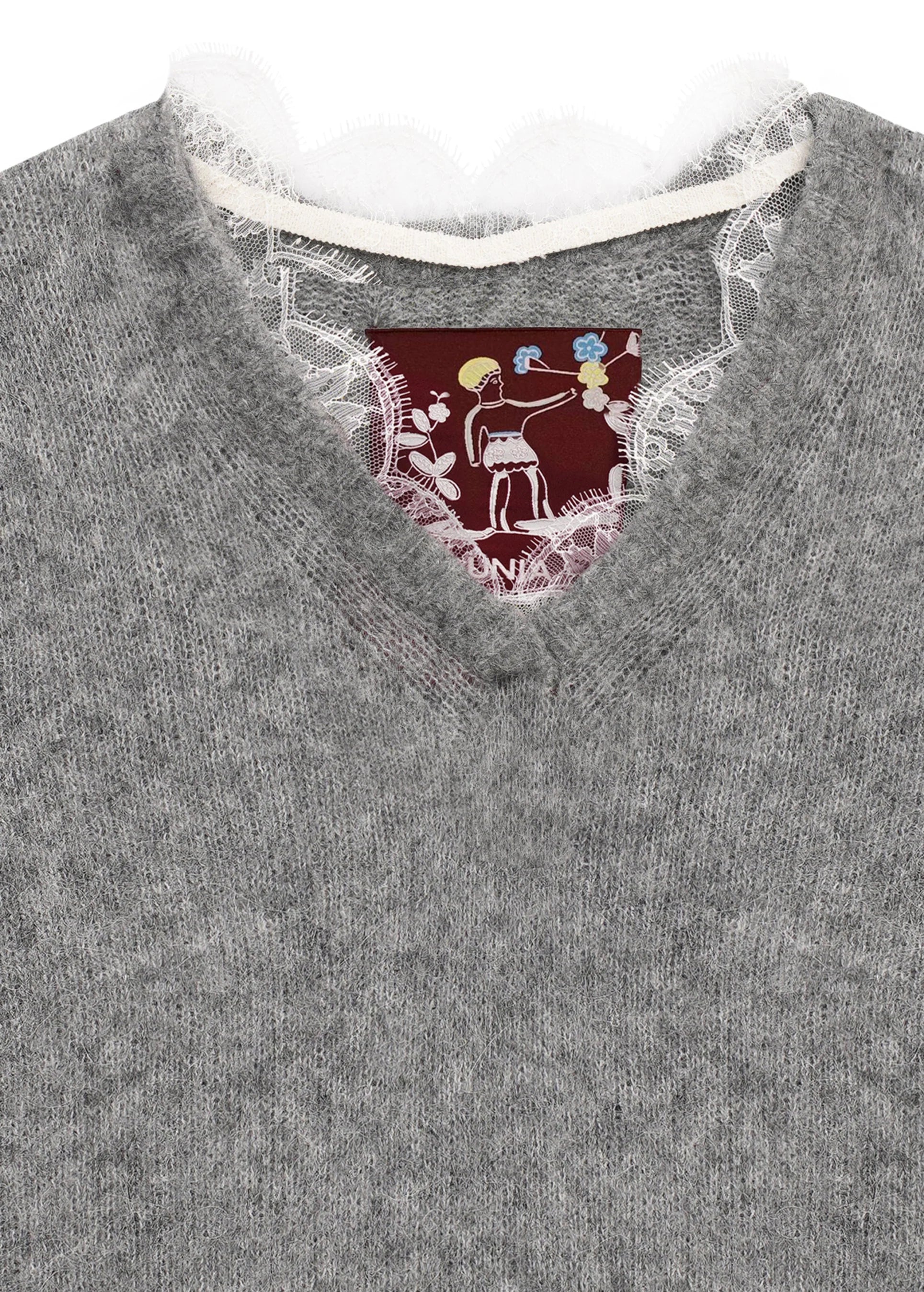 Lace-trimmed Vest in Grey. V-neck, wide elastic band, handcrafted embroidery. A detachable lace embellishes the neckline, allowing the vest to adapt to different moods and occasions. Wear it as an extra layer or a main piece. Use it as a basic wardrobe staple or as a gift that blends the warmth of the garment with the traditional craftsmanship of GUNIA’s artisans.
