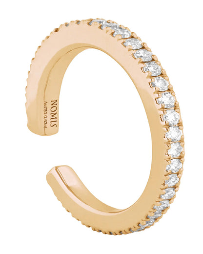 The Olga ear cuff/ ring in L size is an elegant creation, designed with a minimalist 18-karat gold band that frames a row of diamonds. This multifunctional piece can be worn as a statement ear cuff or a ring, blending sophistication and modern aesthetics.