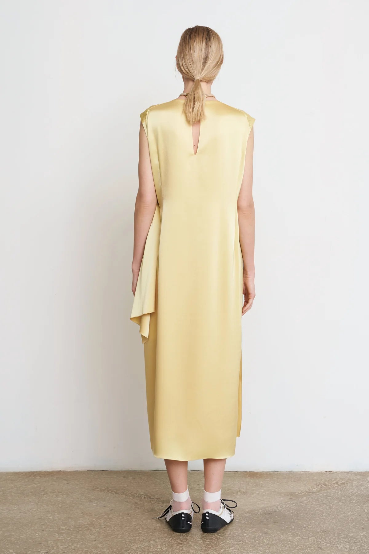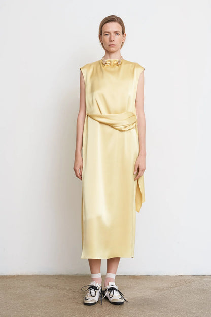 Elevate your evening with this Litkovska satin dress in sunny yellow. The sculptural twisted waist adds a modern edge, while its fluid drape and luxe finish ensure you shine at every occasion.
