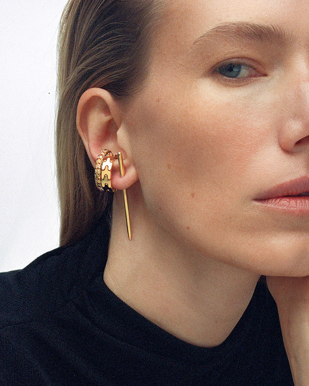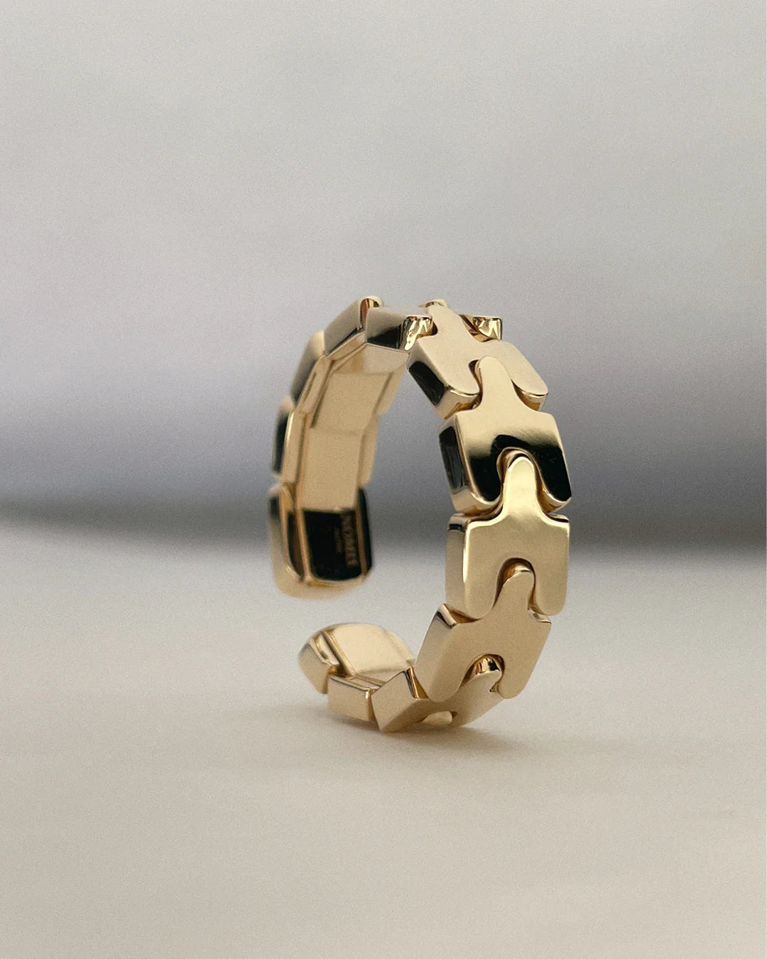 The Mini Mish ear cuff/ ring is handcrafted from 18-karat gold. For this model, artisans introduced a sleek design with sculpted links that form the signature Mish pattern. This versatile piece can be styled as an ear cuff or a ring.