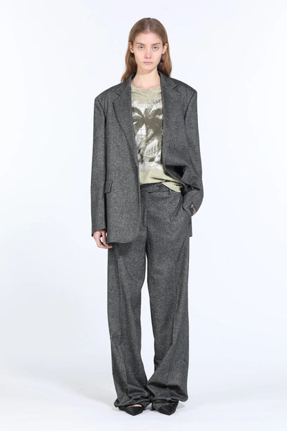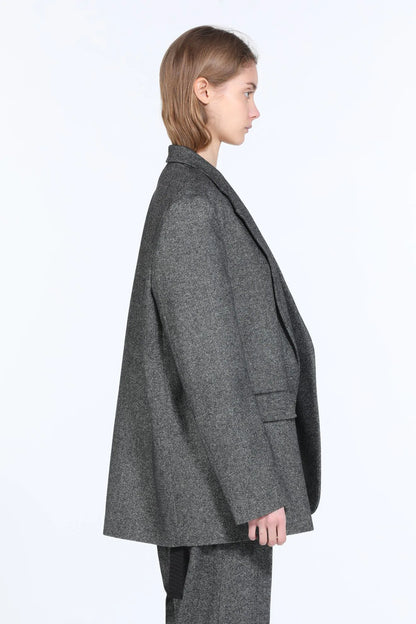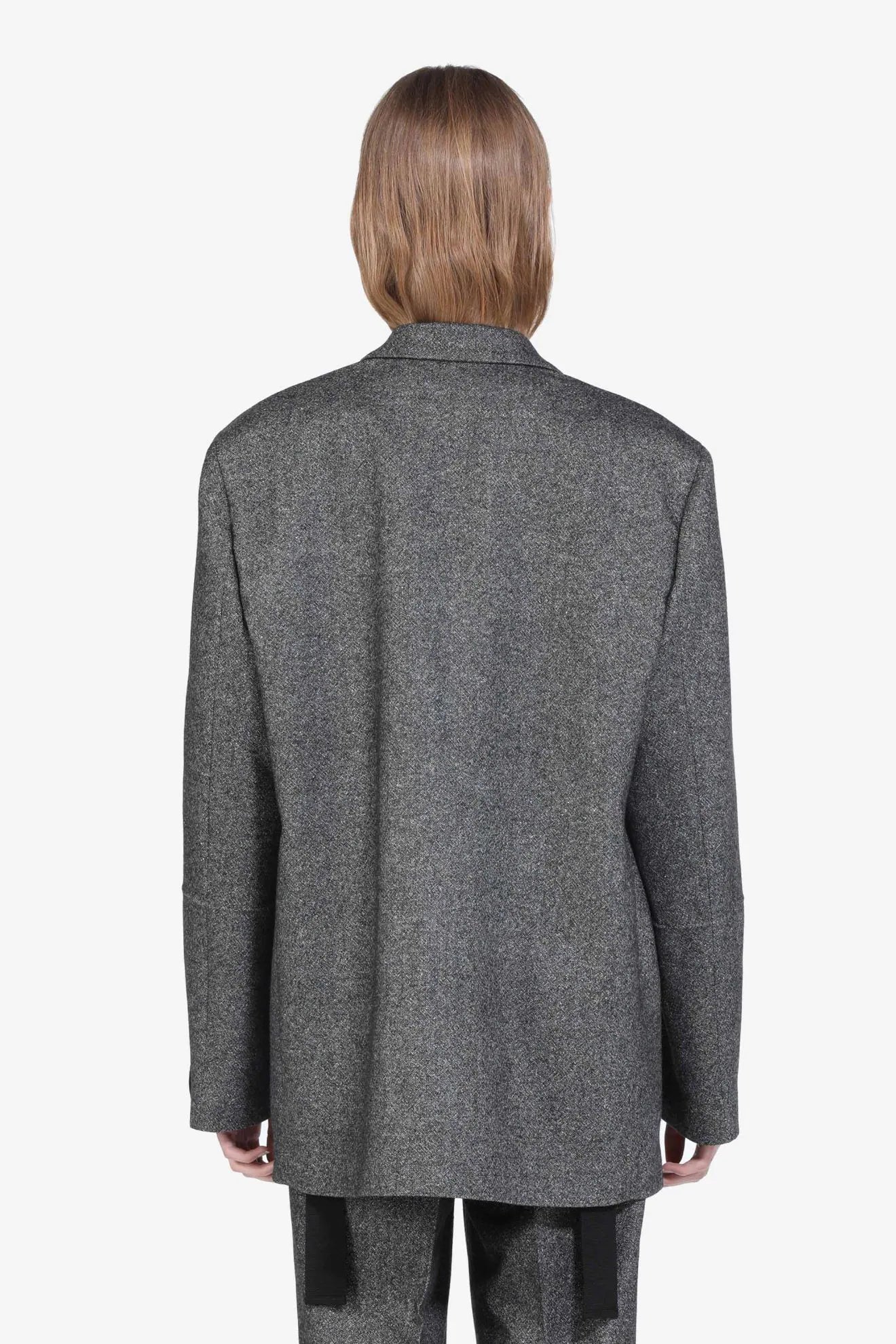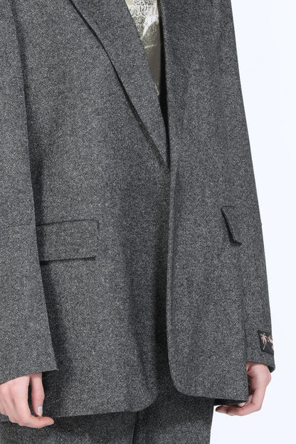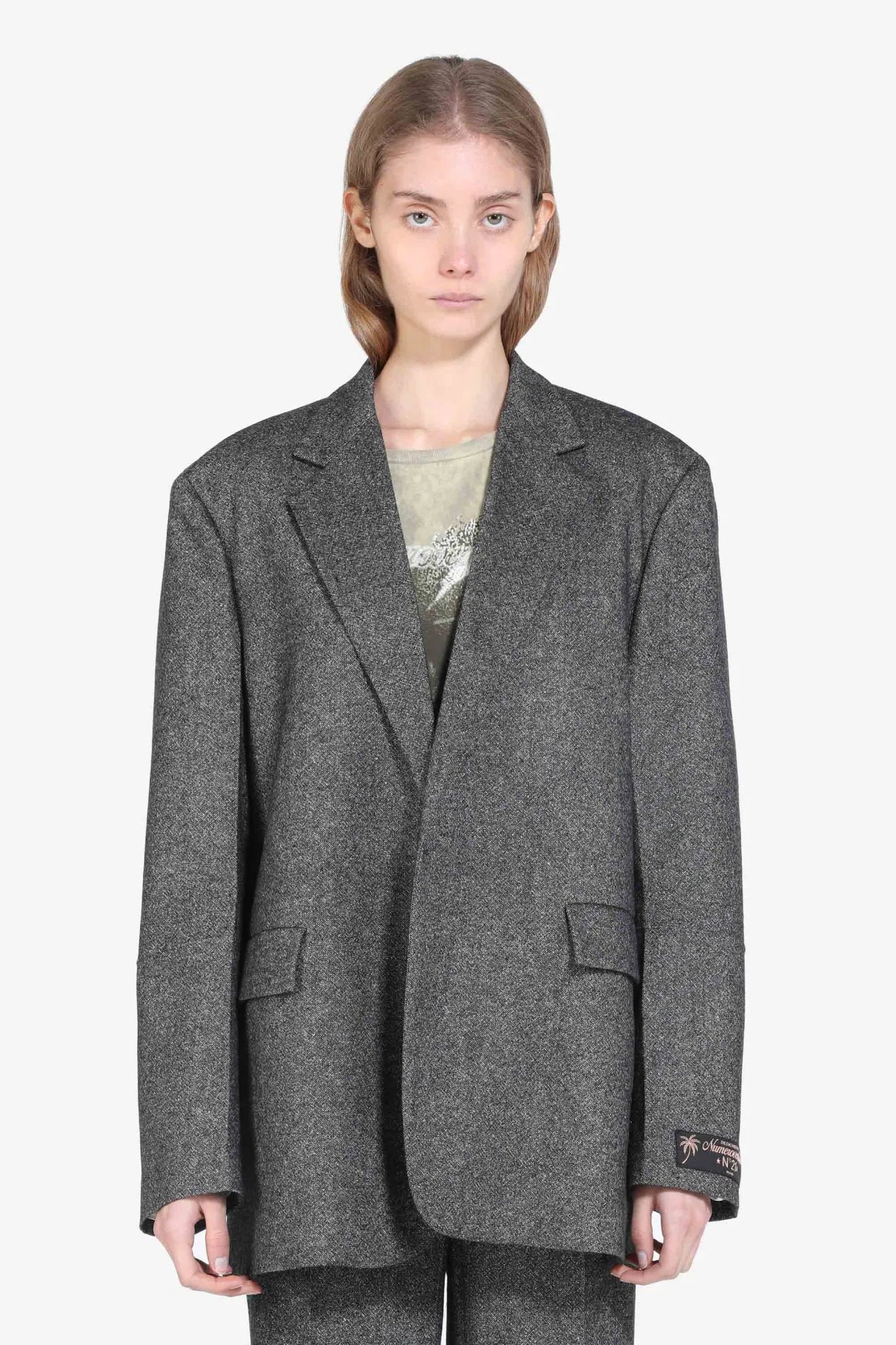 Charcoal-grey oversized wool-blend blazer. Notch lapels. Long sleeves with a N21 logo patch at one cuff. Flap side pockets.
