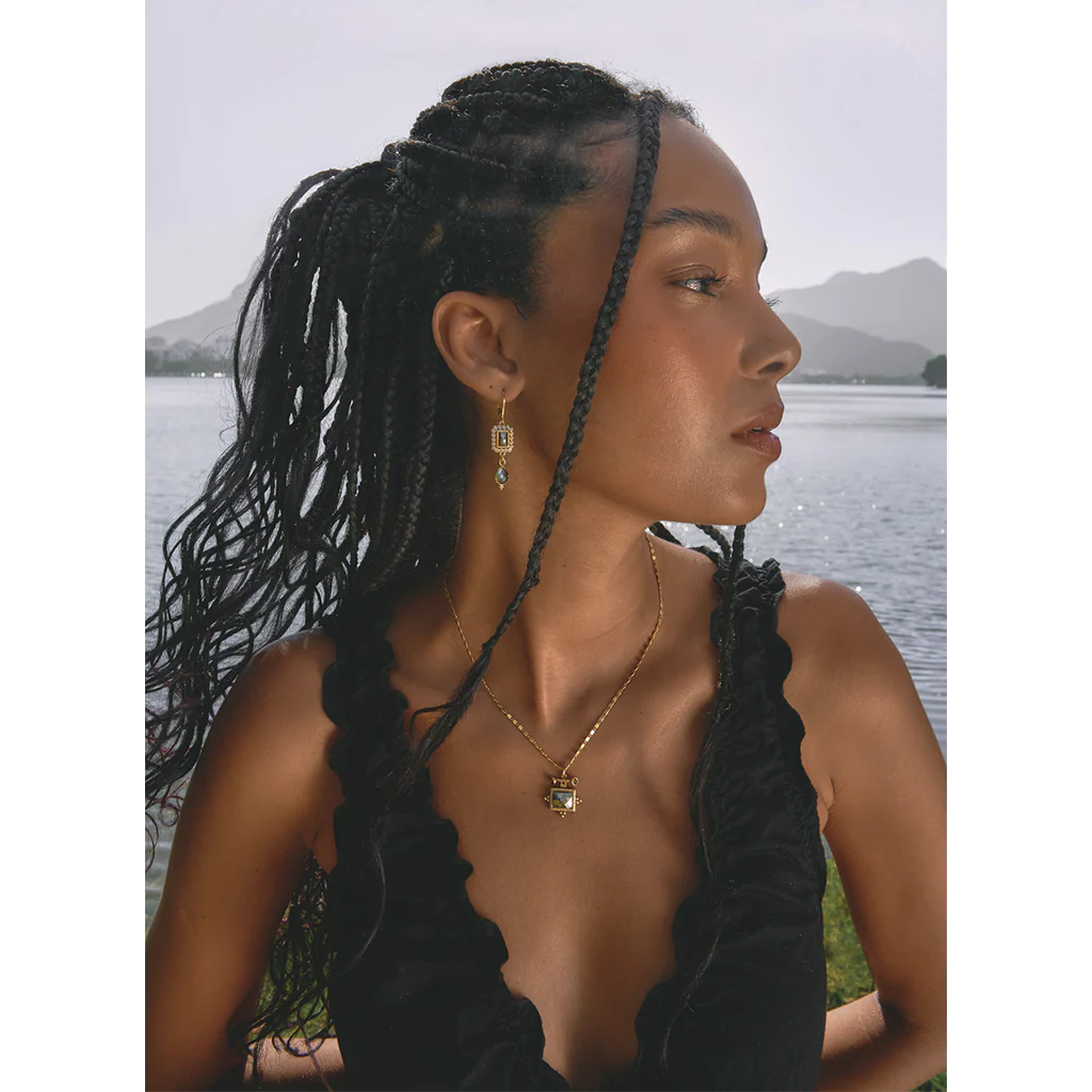 Gold-plated brass earrings (1 micron of 999/1000 gold), semi-precious stones, and Swarovski crystal.