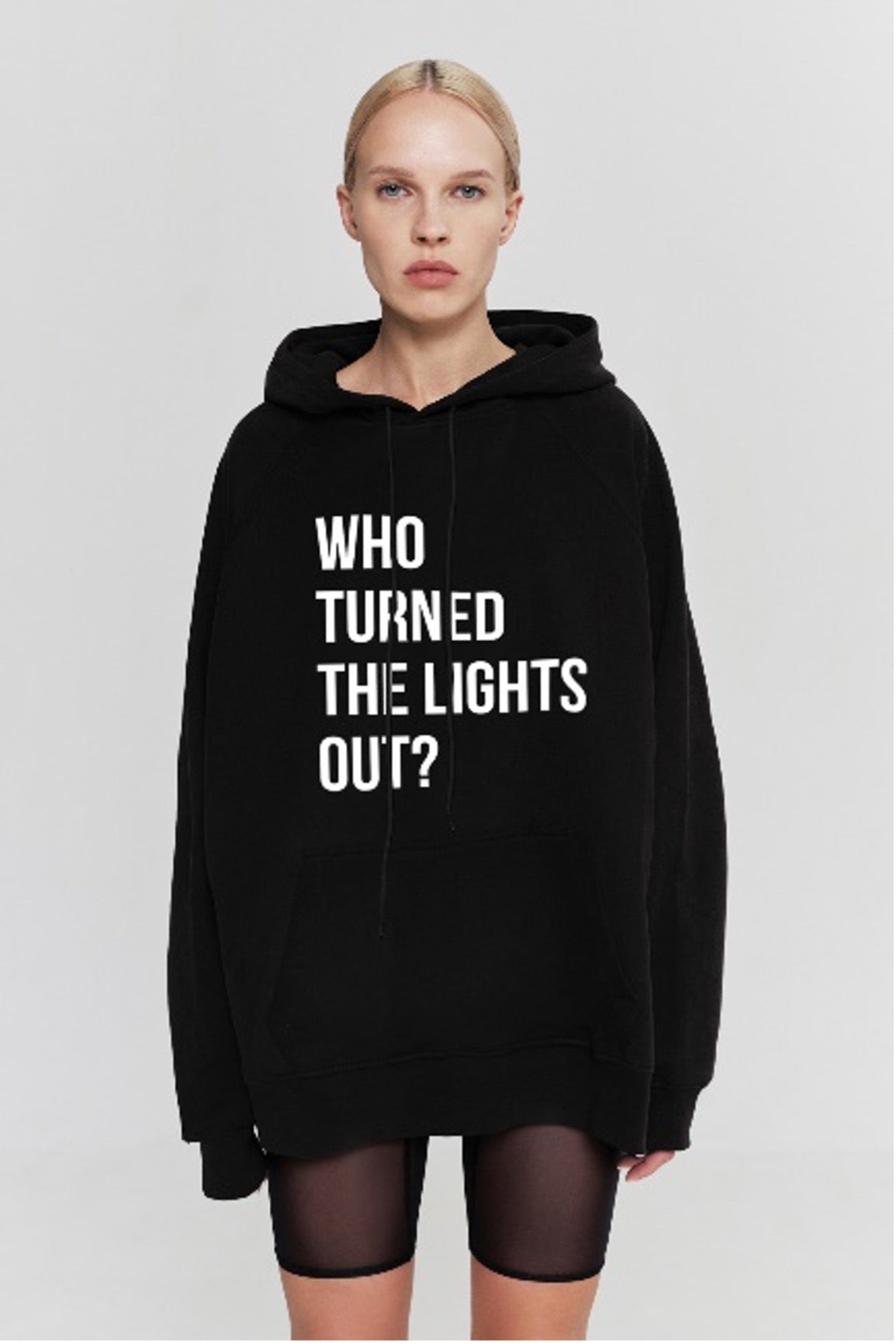 Oversized elongated sweatshirt with a hood. Signature 'Who turned the lights out'