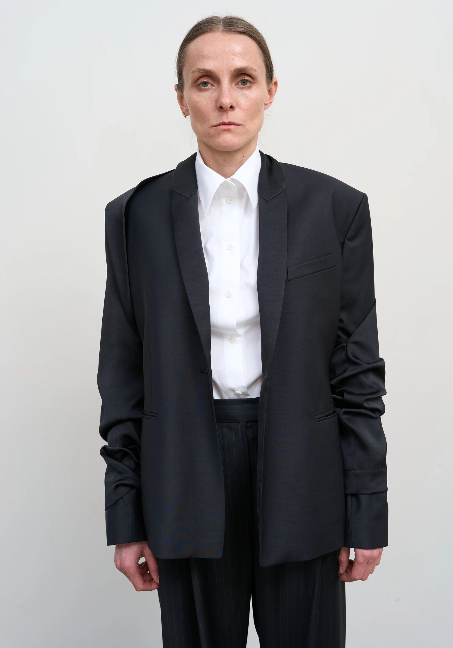 A refined wool-blend tailored jacket designed with adjustable, twistable sleeves.