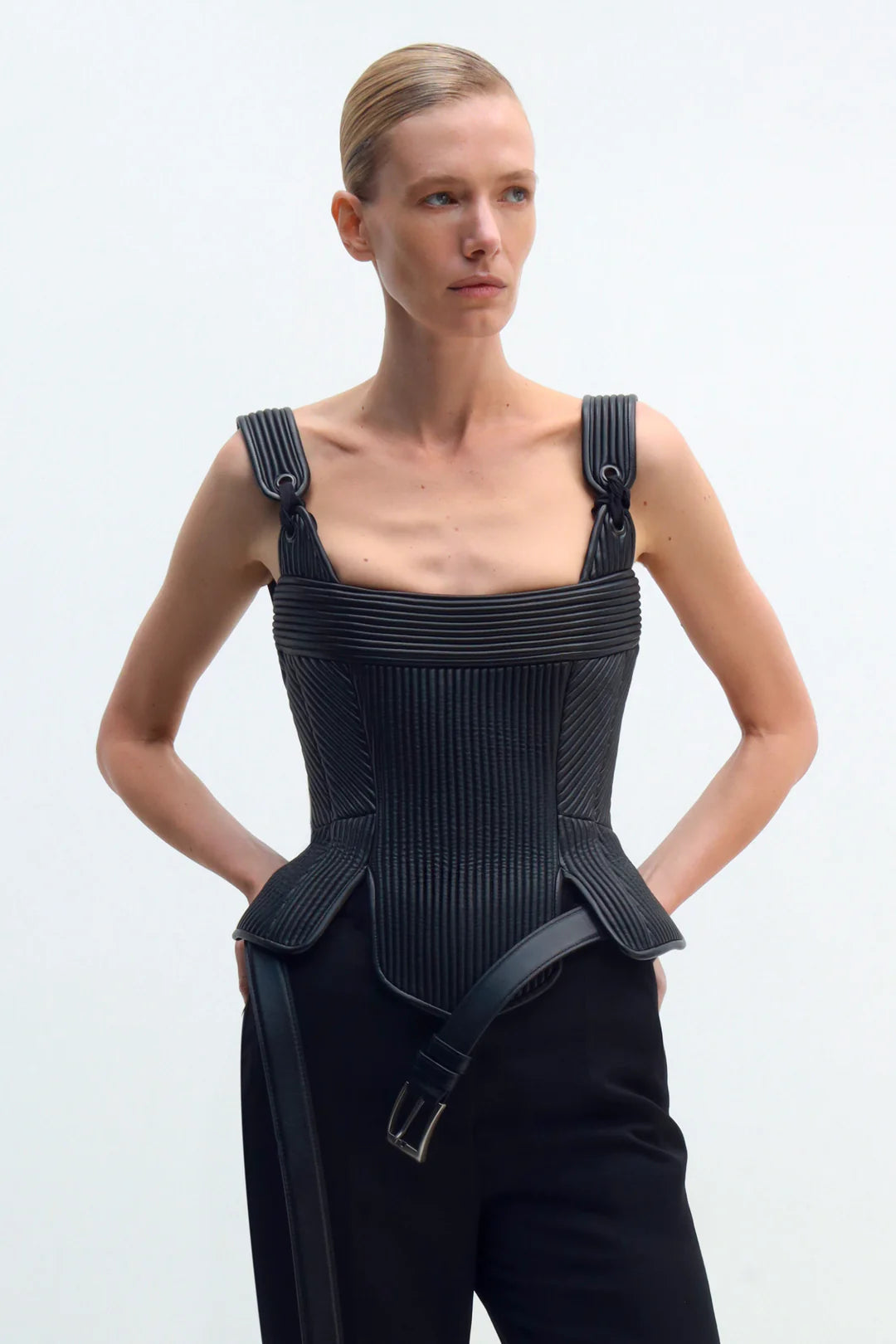 Fitted top with pointed hem and contoured seams that follow the body silhouette