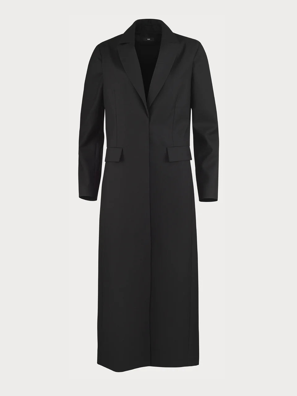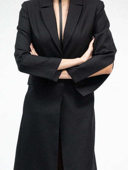 Crafted from 100% wool, the garment boasts a modern, slim fit with clean lines and an extra-long sleeve slit.
